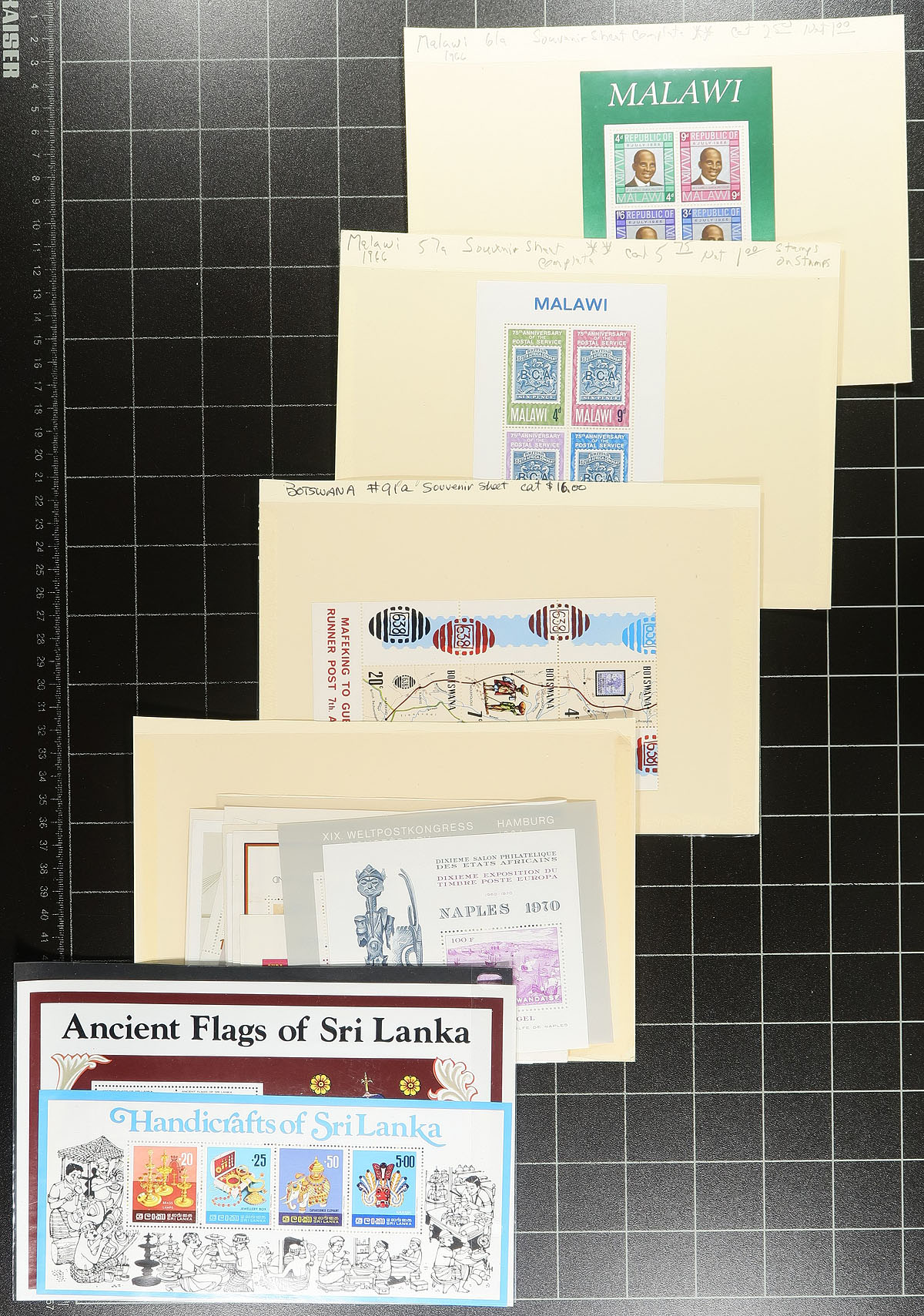 Souvenir Sheet a restrained hoard from a collector who never missed an opportunity to buy random assortments of mini panes, with lots of Europe, Africa, South America (almost everywhere but North America and Australasia). Lots of topical appeal with many identified and priced with individual catalogue values of $5-$20. A number of uncommon items. Almost all mint, never hinged. Several hundred dollars of catalogue value and comes with a near new 16-page stockbook. Estimate =