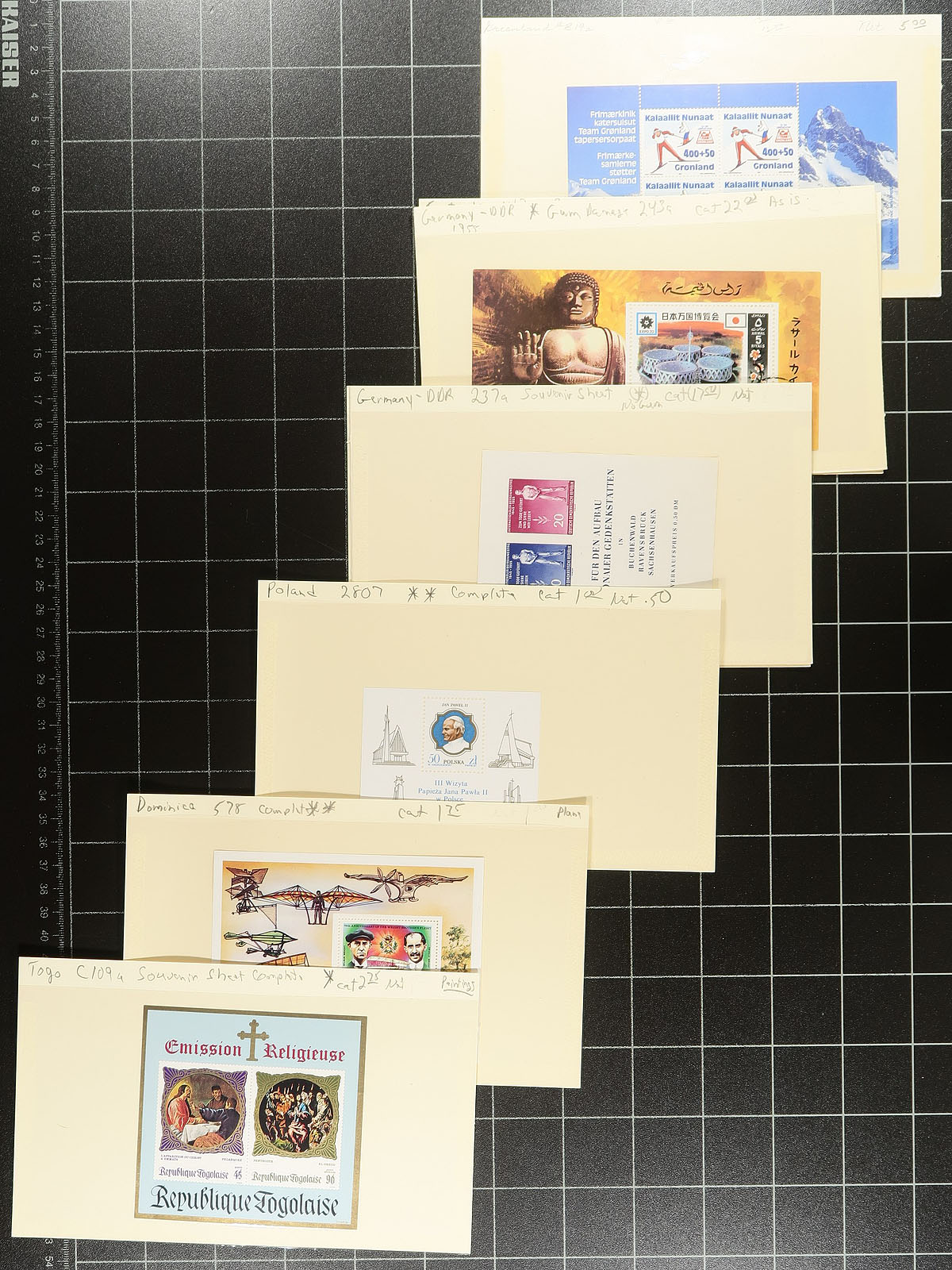 Souvenir Sheet a restrained hoard from a collector who never missed an opportunity to buy random assortments of mini panes, with lots of Europe, Africa, South America (almost everywhere but North America and Australasia). Lots of topical appeal with many identified and priced with individual catalogue values of $5-$20. A number of uncommon items. Almost all mint, never hinged. Several hundred dollars of catalogue value and comes with a near new 16-page stockbook. Estimate =