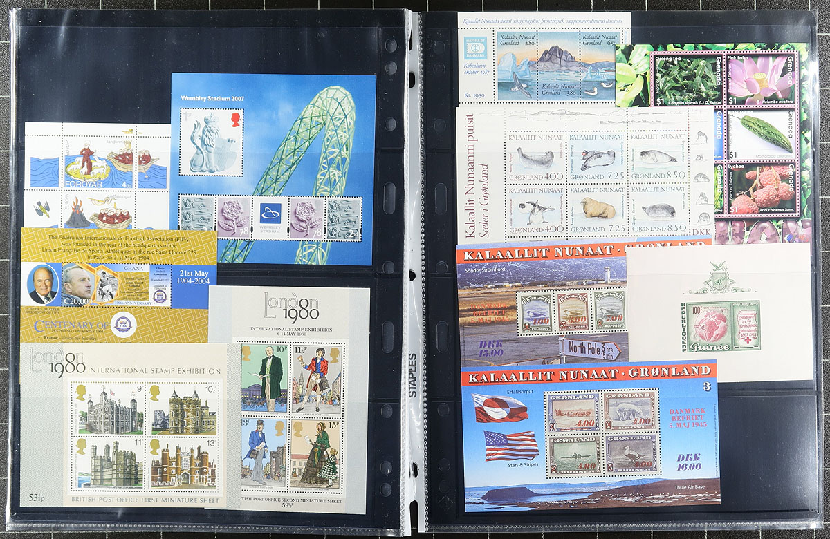 Souvenir Sheet a restrained hoard from a collector who never missed an opportunity to buy random assortments of mini panes, with lots of Europe, Africa, South America (almost everywhere but North America and Australasia). Lots of topical appeal with many identified and priced with individual catalogue values of $5-$20. A number of uncommon items. Almost all mint, never hinged. Several hundred dollars of catalogue value and comes with a near new 16-page stockbook. Estimate =