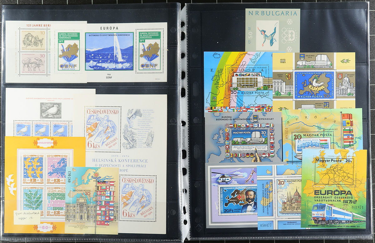 Souvenir Sheet a restrained hoard from a collector who never missed an opportunity to buy random assortments of mini panes, with lots of Europe, Africa, South America (almost everywhere but North America and Australasia). Lots of topical appeal with many identified and priced with individual catalogue values of $5-$20. A number of uncommon items. Almost all mint, never hinged. Several hundred dollars of catalogue value and comes with a near new 16-page stockbook. Estimate =