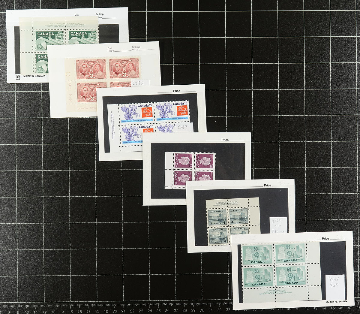 Mint plate block accumulation #1: The earlier regular issues. Generally, 1940's-1970 commemoratives and definitives, with a mix of single corners and matched sets. From an assortment of former bidboard lots, so there is an uneven mix of issues (including a blend of hinged and never hinged). Includes better such as the 13c "Ram Tank". There might be a few "field stock" corners, but most are inscription or plate number corners. The total catalogue value will be enormous. Estimate =
