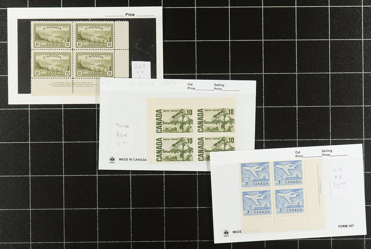 Mint plate block accumulation #1: The earlier regular issues. Generally, 1940's-1970 commemoratives and definitives, with a mix of single corners and matched sets. From an assortment of former bidboard lots, so there is an uneven mix of issues (including a blend of hinged and never hinged). Includes better such as the 13c "Ram Tank". There might be a few "field stock" corners, but most are inscription or plate number corners. The total catalogue value will be enormous. Estimate =