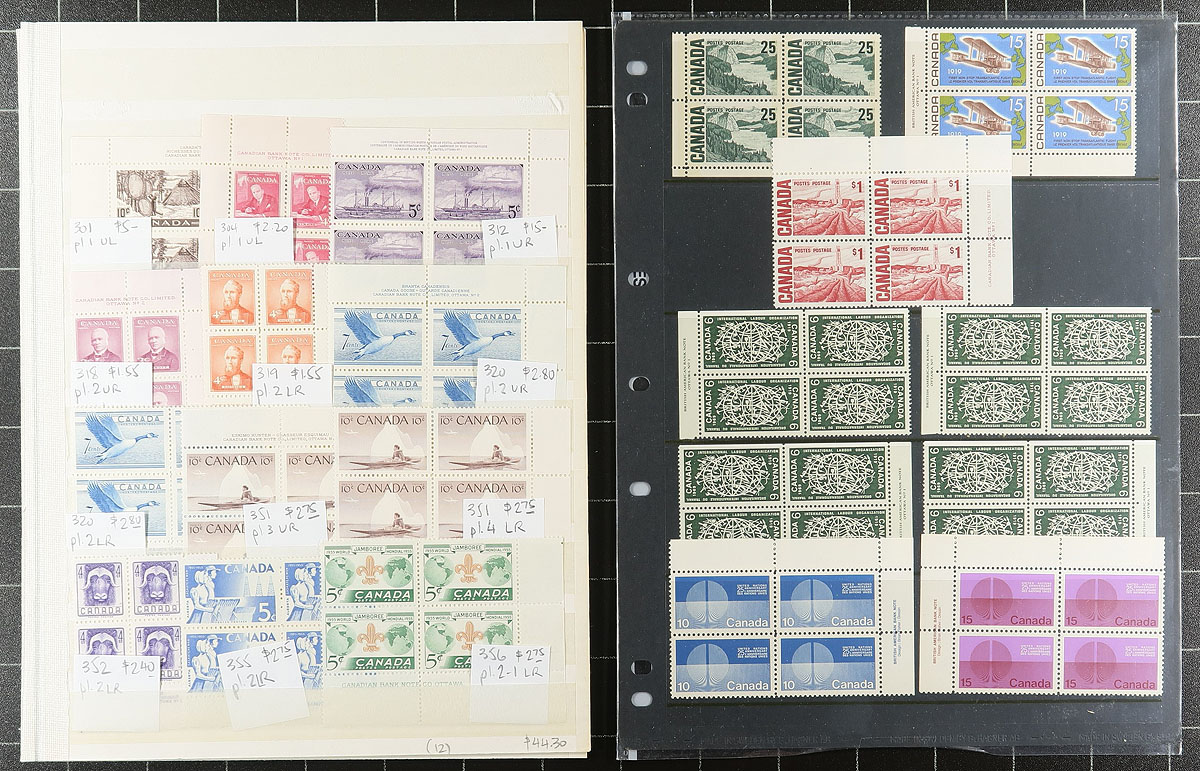 Mint plate block accumulation #1: The earlier regular issues. Generally, 1940's-1970 commemoratives and definitives, with a mix of single corners and matched sets. From an assortment of former bidboard lots, so there is an uneven mix of issues (including a blend of hinged and never hinged). Includes better such as the 13c "Ram Tank". There might be a few "field stock" corners, but most are inscription or plate number corners. The total catalogue value will be enormous. Estimate =