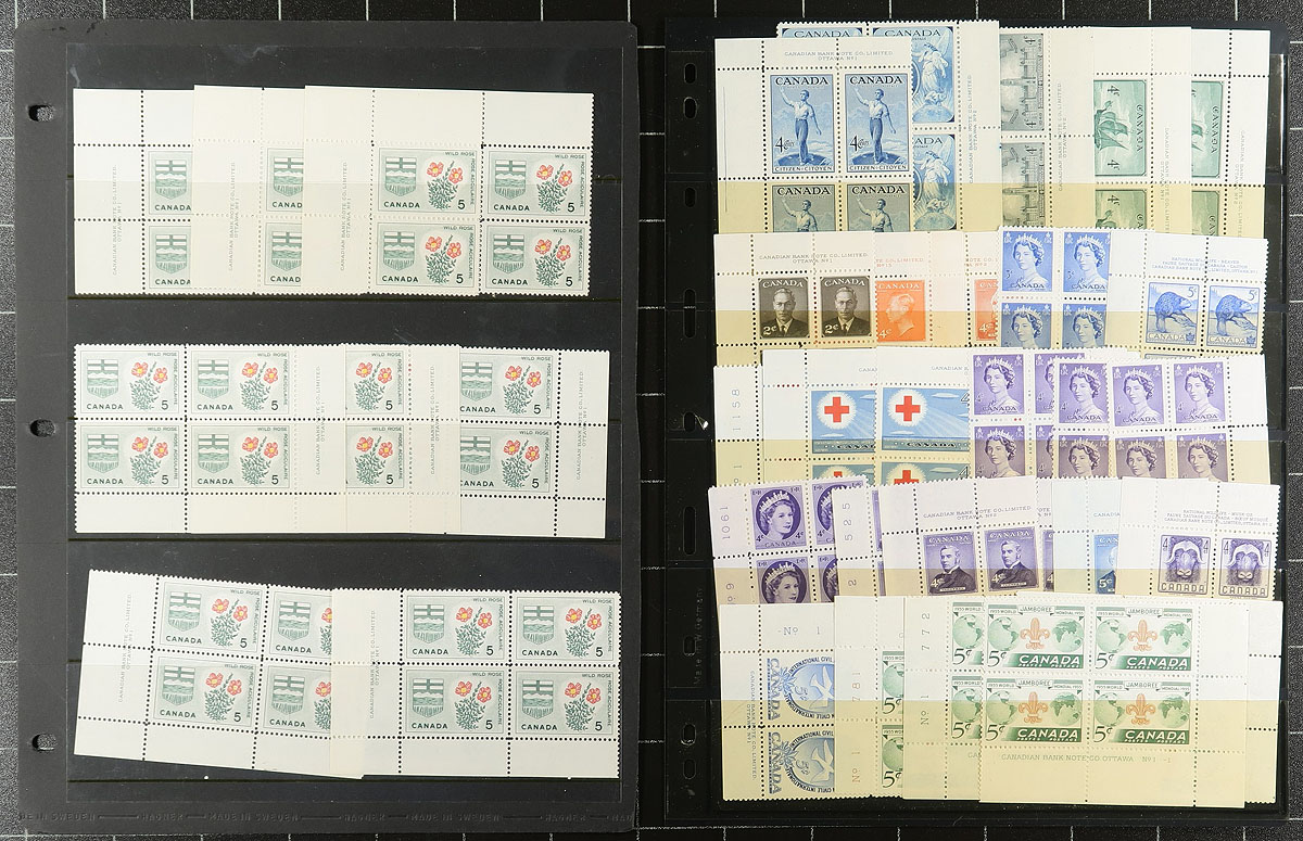 Mint plate block accumulation #1: The earlier regular issues. Generally, 1940's-1970 commemoratives and definitives, with a mix of single corners and matched sets. From an assortment of former bidboard lots, so there is an uneven mix of issues (including a blend of hinged and never hinged). Includes better such as the 13c "Ram Tank". There might be a few "field stock" corners, but most are inscription or plate number corners. The total catalogue value will be enormous. Estimate =