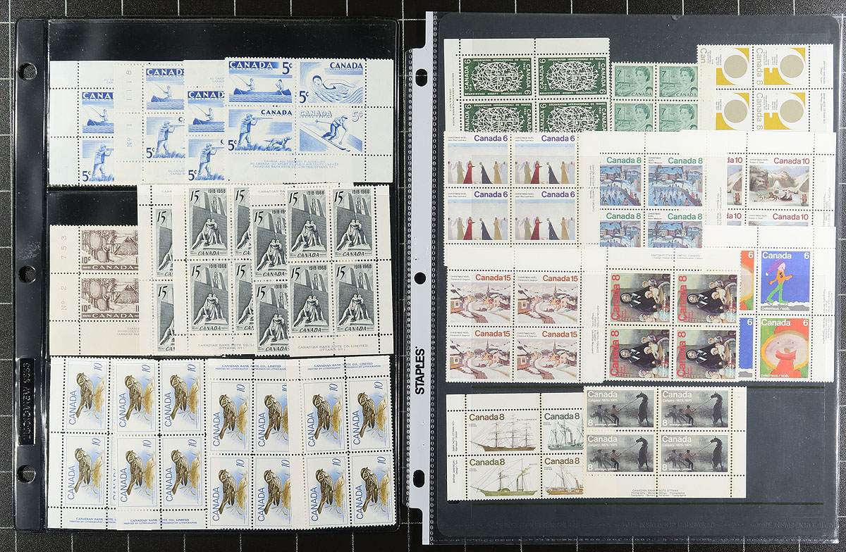Mint plate block accumulation #2: The "later" regular issues. Generally, 1970-1985 (with a few earlier slipping in) commemoratives and definitives, with a mix of single corners and matched sets. A few of the modern are in their original PO packs. From an assortment of former bidboard lots, so there is an uneven mix of issues (including a blend of hinged and never hinged). Includes better early 1970's issues such as CBC, Vimy, Geological, Landscapes. There might be a couple of "field stock" corners, but most are inscription corners. The total catalogue value will be enormous. Estimate =