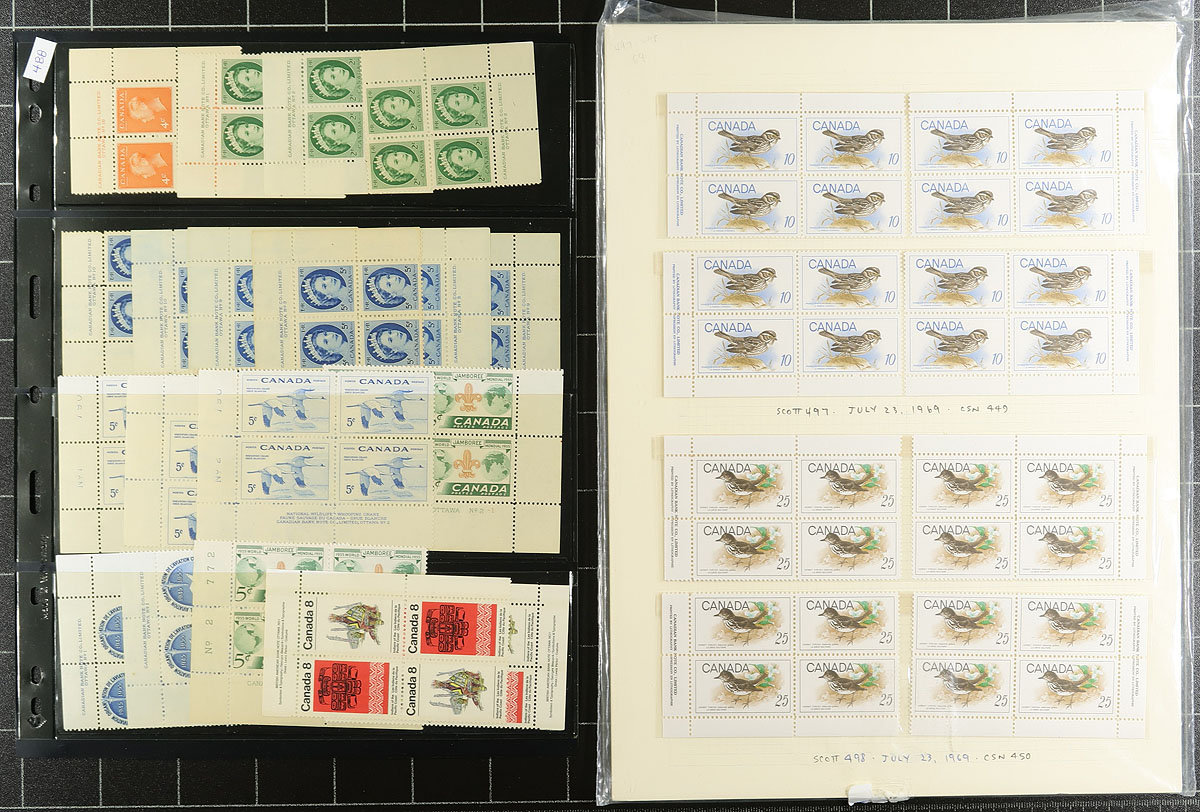 Mint plate block accumulation #2: The "later" regular issues. Generally, 1970-1985 (with a few earlier slipping in) commemoratives and definitives, with a mix of single corners and matched sets. A few of the modern are in their original PO packs. From an assortment of former bidboard lots, so there is an uneven mix of issues (including a blend of hinged and never hinged). Includes better early 1970's issues such as CBC, Vimy, Geological, Landscapes. There might be a couple of "field stock" corners, but most are inscription corners. The total catalogue value will be enormous. Estimate =