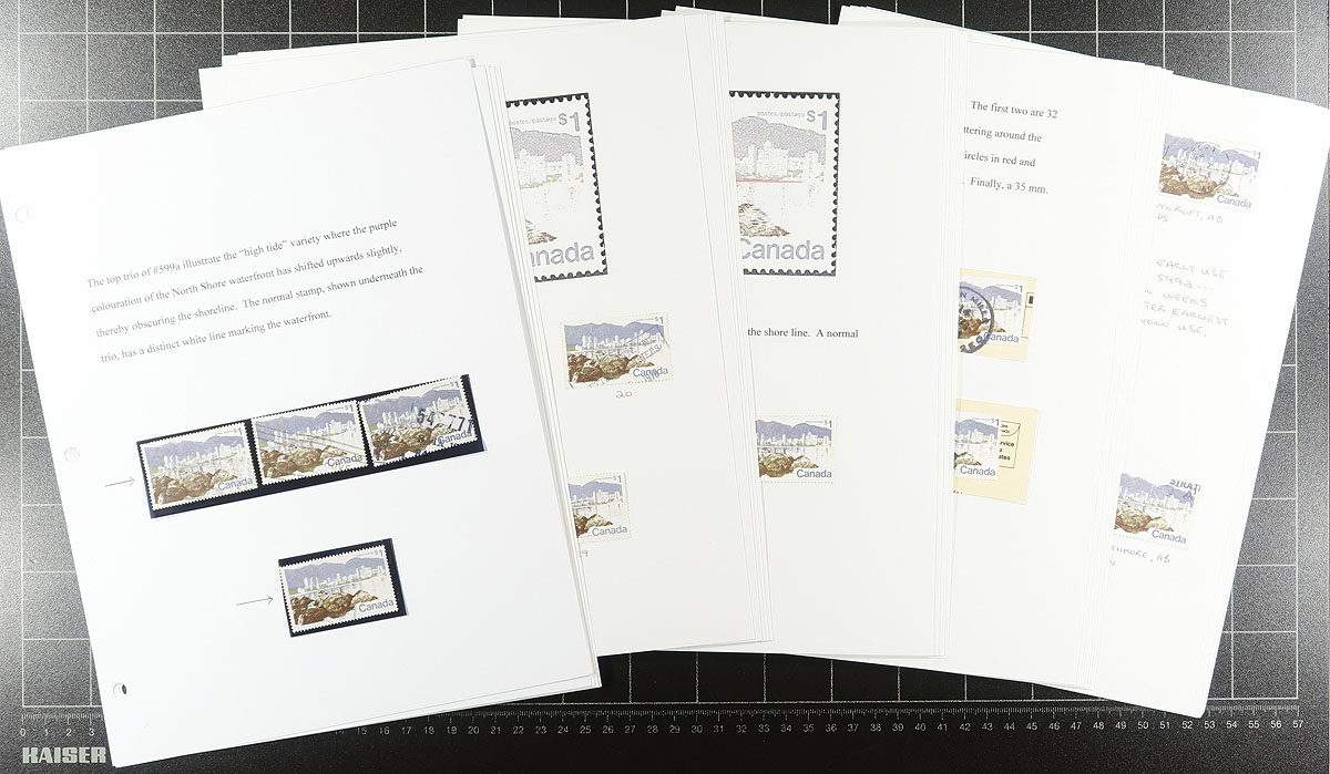 Used "Varieties", a mix of errors, perforation shifts, tagging shifts and omissions, and a trio of "flyspeck" studies. A very strong start with a scarce example of the used "Missing Bird on Totem" #572ii, a couple of copies of 44c Walrus #1171c, some re-entries, Admiral "hairlines". The flyspeck group are $1 Vancouver, 50c "Street Scene" and $2.00 Banff (the last with a small bundle of documentation!). Some of these are Unitrade listed, most are not. Estimate =