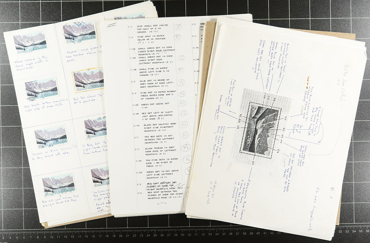 Used "Varieties", a mix of errors, perforation shifts, tagging shifts and omissions, and a trio of "flyspeck" studies. A very strong start with a scarce example of the used "Missing Bird on Totem" #572ii, a couple of copies of 44c Walrus #1171c, some re-entries, Admiral "hairlines". The flyspeck group are $1 Vancouver, 50c "Street Scene" and $2.00 Banff (the last with a small bundle of documentation!). Some of these are Unitrade listed, most are not. Estimate =