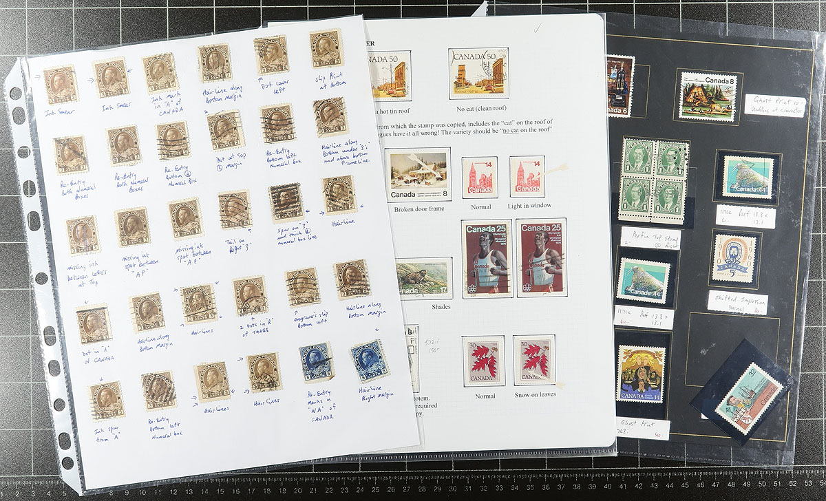 Used "Varieties", a mix of errors, perforation shifts, tagging shifts and omissions, and a trio of "flyspeck" studies. A very strong start with a scarce example of the used "Missing Bird on Totem" #572ii, a couple of copies of 44c Walrus #1171c, some re-entries, Admiral "hairlines". The flyspeck group are $1 Vancouver, 50c "Street Scene" and $2.00 Banff (the last with a small bundle of documentation!). Some of these are Unitrade listed, most are not. Estimate =