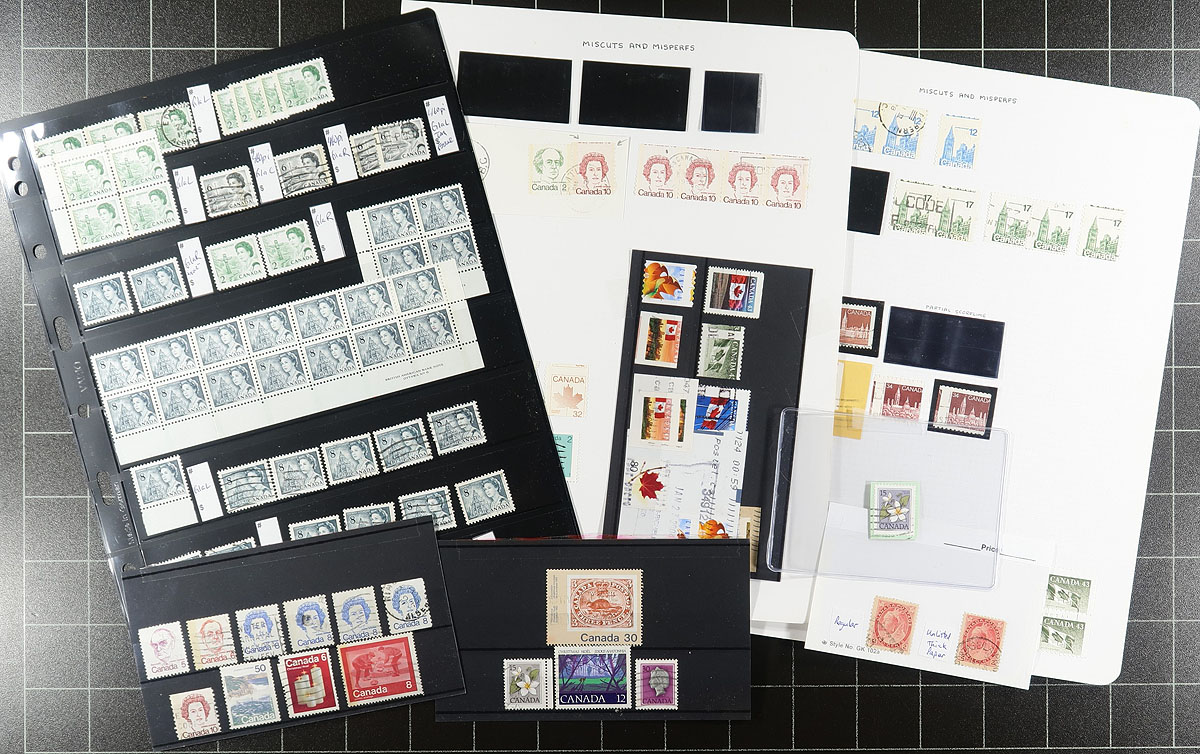 Used "Varieties", a mix of errors, perforation shifts, tagging shifts and omissions, and a trio of "flyspeck" studies. A very strong start with a scarce example of the used "Missing Bird on Totem" #572ii, a couple of copies of 44c Walrus #1171c, some re-entries, Admiral "hairlines". The flyspeck group are $1 Vancouver, 50c "Street Scene" and $2.00 Banff (the last with a small bundle of documentation!). Some of these are Unitrade listed, most are not. Estimate =