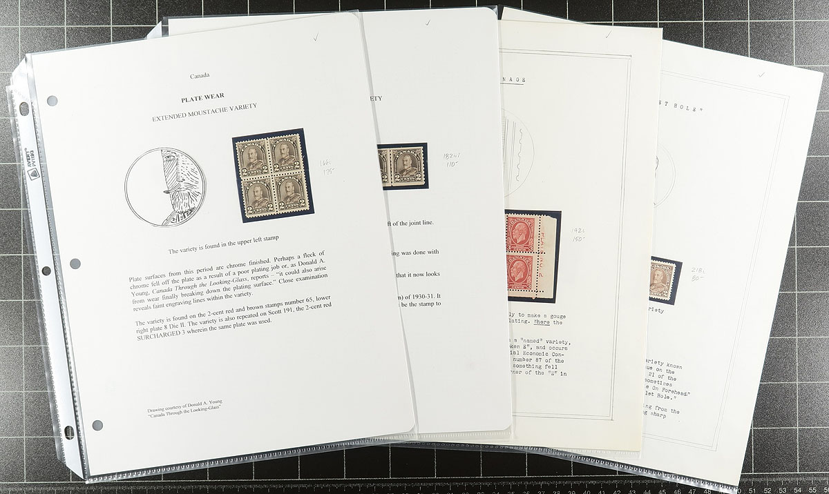 Quartet of classic King George V varieties, beautifully mounted on its own album page. Includes a 2c brown "Arch" block with "Extended Moustache" (hinge remnant), #182iii "Cockeyed King" coil line pair (heavy hinge), #192i "Broken E" in lower right plate #2 block of 8 (no gum) and the 2c brown KGV pictorial with "Mole in Forehead" (no gum). A very attractive group. Estimate =