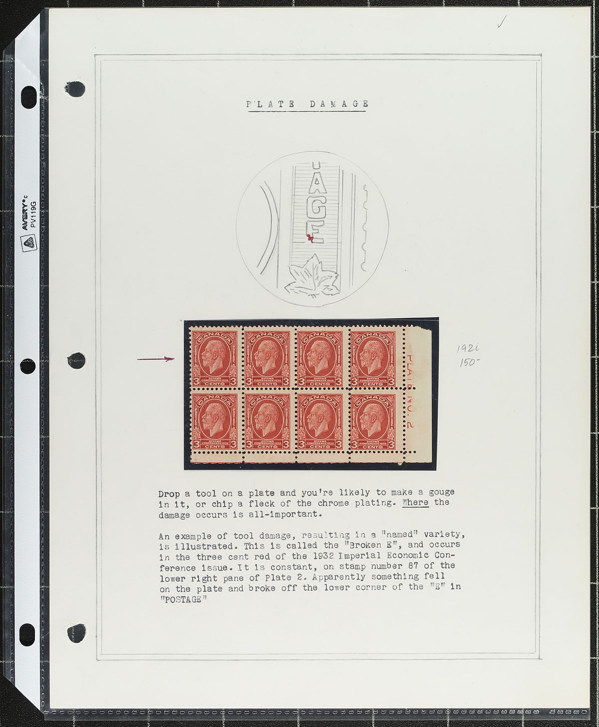 Quartet of classic King George V varieties, beautifully mounted on its own album page. Includes a 2c brown "Arch" block with "Extended Moustache" (hinge remnant), #182iii "Cockeyed King" coil line pair (heavy hinge), #192i "Broken E" in lower right plate #2 block of 8 (no gum) and the 2c brown KGV pictorial with "Mole in Forehead" (no gum). A very attractive group. Estimate =