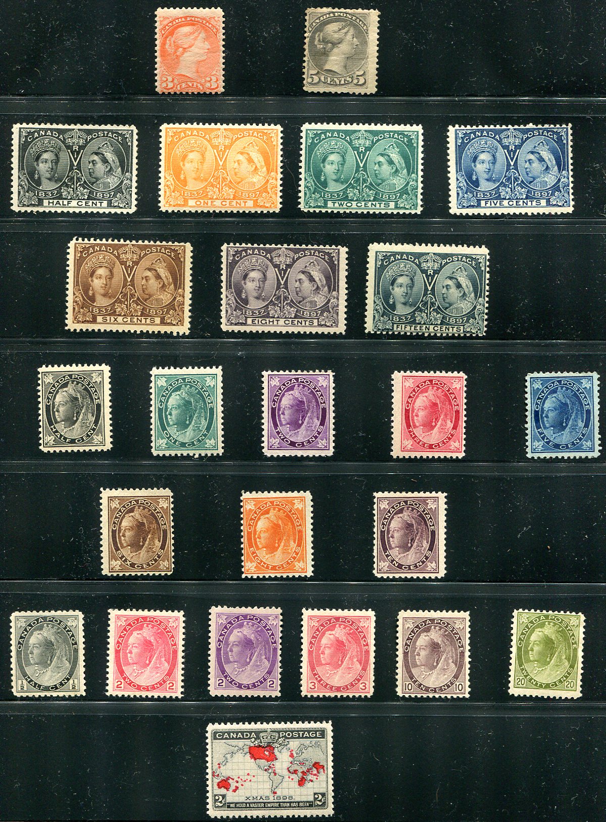 A page of mint Queen Victoria issues, with a couple of Small Queens, 7 "Jubilees", a complete "Leaf" set, much of the "Numeral" set, including the 10c and 20c and a Map stamp. Fresh appearance, with many being off-centre. The backs are a different story, with a few being never hinged, but many with heavy hinging, hinge remnants and a couple with gum creases. Perfect if you are more concerned about the front of the stamp. 2025 Scott US$4020.00 =