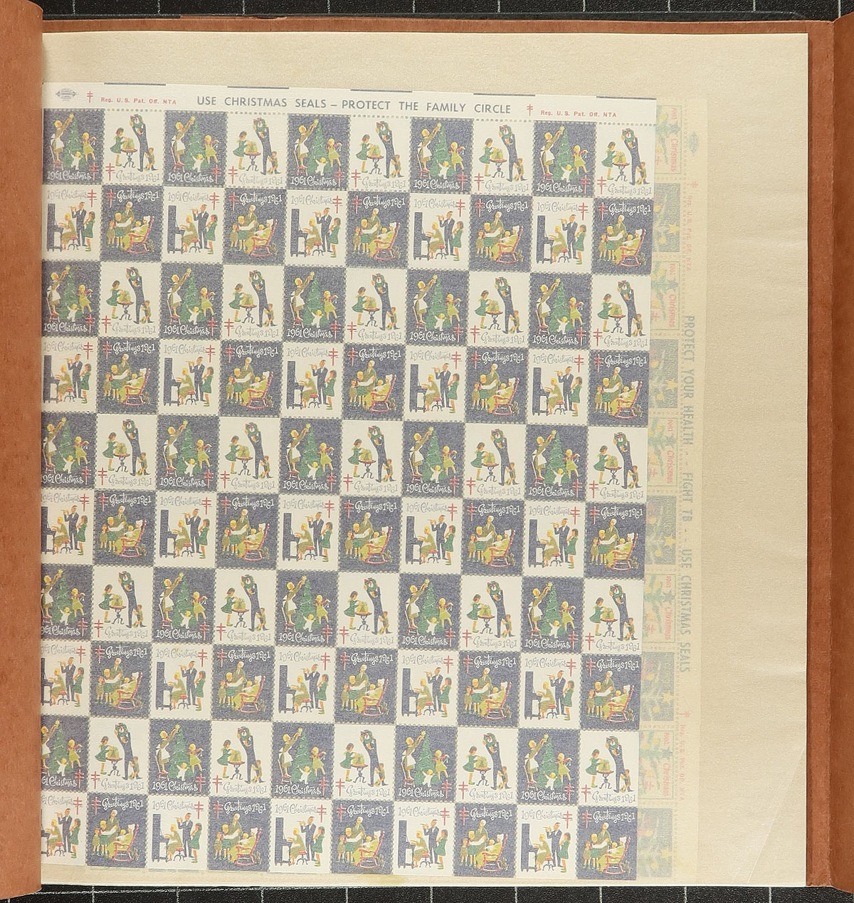 Cinderella Stamps. Huge holding of Cinderellas, labels, poster stamps, fundraisers, etc. in two volumes. The first is a binder, with material spilling out of it everywhere. There is some better material, such as French "Chateau de Malmaison" imperf and perforated sets, a good batch of Air Mail related (Including some Italian Air Mail anniversary material), Vancouver 1936 Jubilee partial sheet (no gum), some material from philatelic exhibitions, lots of British Islands, and it just goes on. The second is an old "Gimbels" mint sheet binder, with complete sheets of US TB Christmas seals from 1935-2001 (lots here!). Estimate =