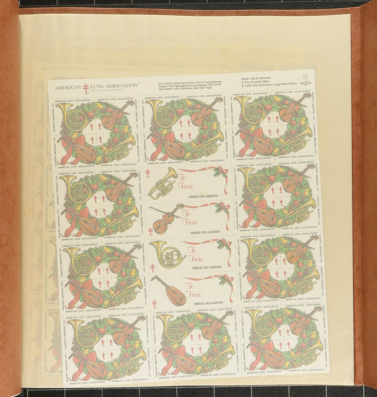 Cinderella Stamps. Huge holding of Cinderellas, labels, poster stamps, fundraisers, etc. in two volumes. The first is a binder, with material spilling out of it everywhere. There is some better material, such as French "Chateau de Malmaison" imperf and perforated sets, a good batch of Air Mail related (Including some Italian Air Mail anniversary material), Vancouver 1936 Jubilee partial sheet (no gum), some material from philatelic exhibitions, lots of British Islands, and it just goes on. The second is an old "Gimbels" mint sheet binder, with complete sheets of US TB Christmas seals from 1935-2001 (lots here!). Estimate =