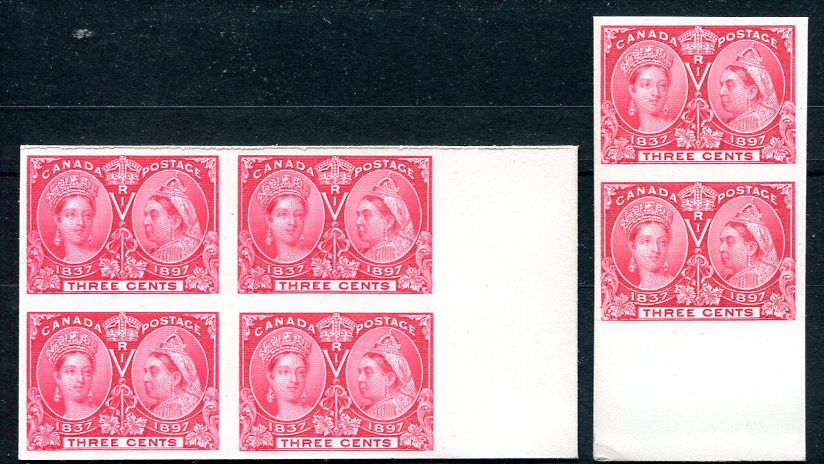 A sextet of plate proofs of the 1897 3c red Queen Victoria "Jubilee" issue. With a right margin block of four, combined with vertical pair from the bottom of a sheet. Great colour, good margins. Printed on India Paper, mounted on card. Only 3,000 known to exist. 2025 Unitrade =
