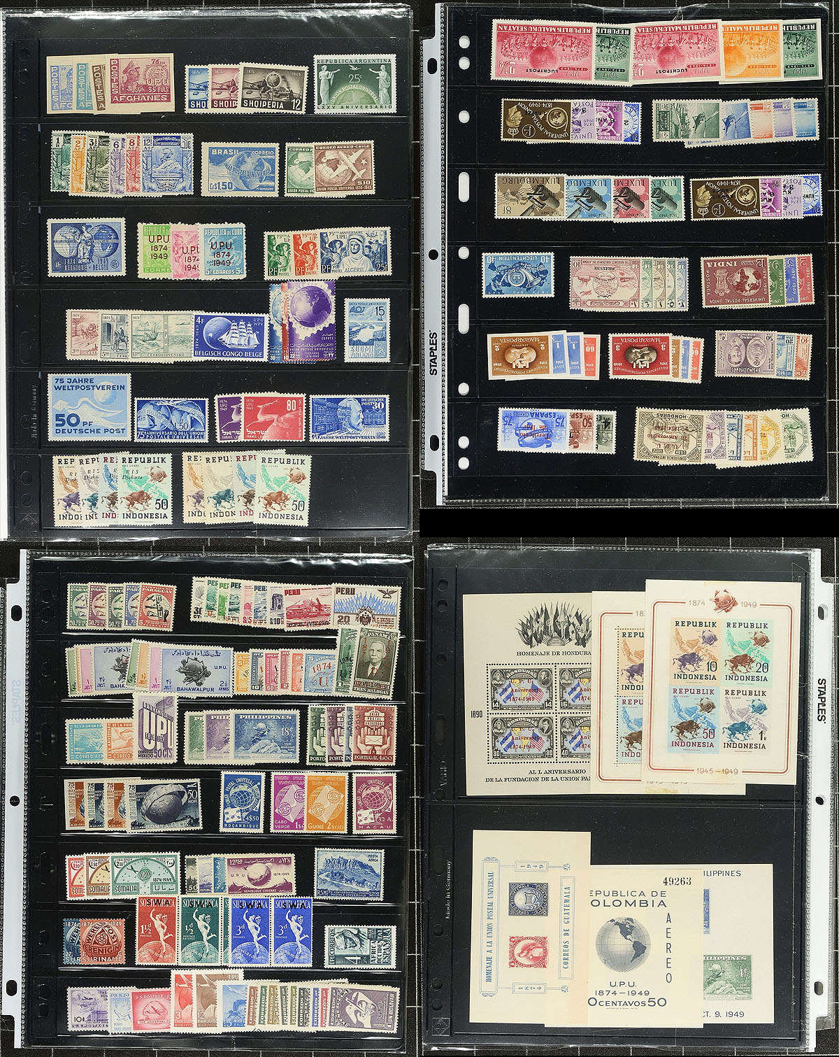 United Postal Union 75th anniversary selection of 50 different countries in complete sets (with none of the British Commonwealth "Common design" printings. There is a bit of staining on the Indonesia souvenir sheets (cat $65.00), otherwise a F/VF mint hinged group. Inventory list is included. Owner’s 2021 Scott US$670.00 =