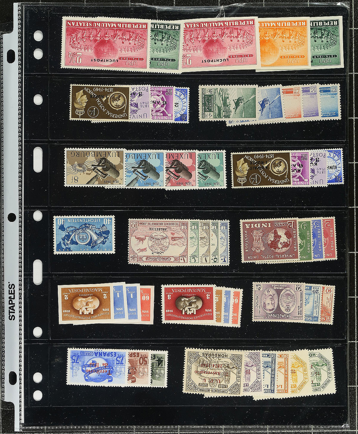 United Postal Union 75th anniversary selection of 50 different countries in complete sets (with none of the British Commonwealth "Common design" printings. There is a bit of staining on the Indonesia souvenir sheets (cat $65.00), otherwise a F/VF mint hinged group. Inventory list is included. Owner’s 2021 Scott US$670.00 =