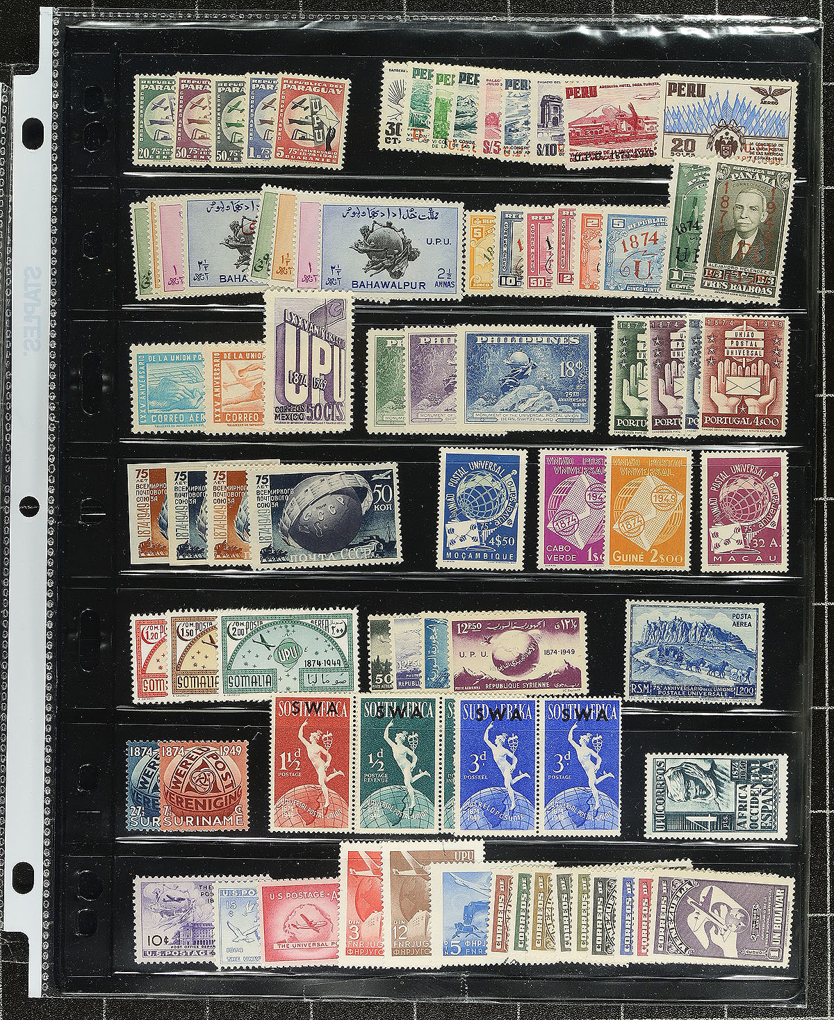 United Postal Union 75th anniversary selection of 50 different countries in complete sets (with none of the British Commonwealth "Common design" printings. There is a bit of staining on the Indonesia souvenir sheets (cat $65.00), otherwise a F/VF mint hinged group. Inventory list is included. Owner’s 2021 Scott US$670.00 =