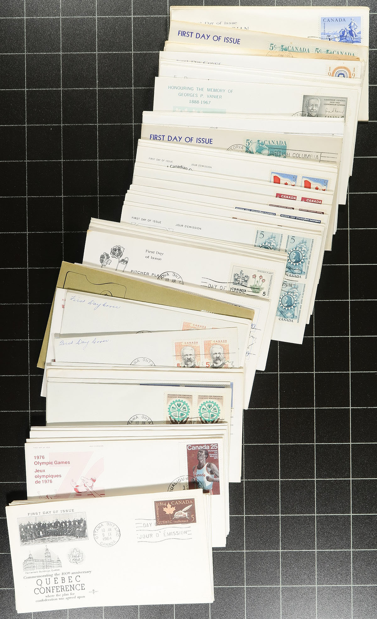 First Day Covers. Private cachet first day covers (mostly 1960-1980), filling an old butter box. Several hundred, about 2/3 are "Rosecraft" (including some in different coloured cachets) and the balance are from a wide array of cachet makers and a few are private or stamp club produced. Many are singles, but we did see a couple of batches with corner blocks. Most are addressed, as you would expect. There isn’t much order to this group, as the owner put them together from a variety of sources. A digger’s special! Estimate =