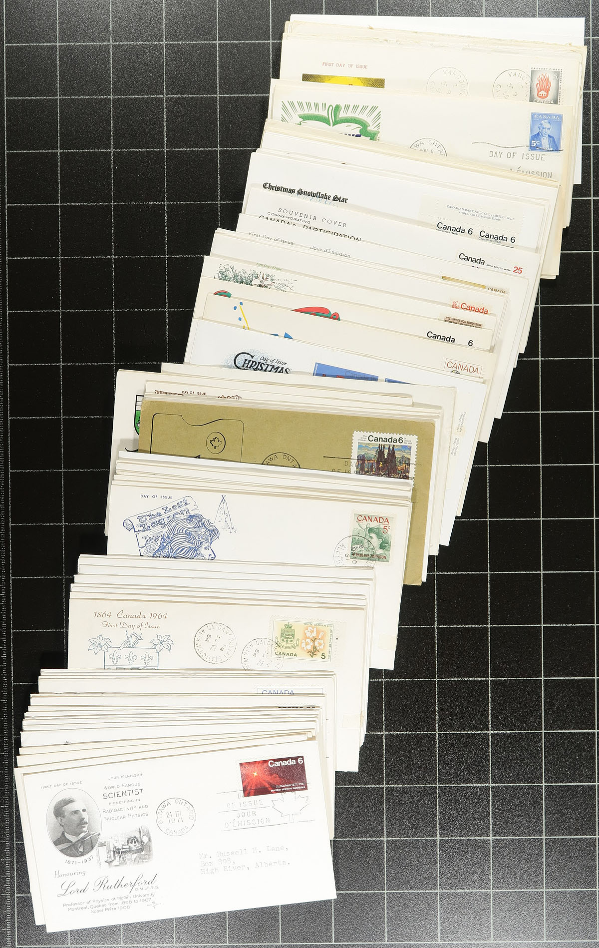 First Day Covers. Private cachet first day covers (mostly 1960-1980), filling an old butter box. Several hundred, about 2/3 are "Rosecraft" (including some in different coloured cachets) and the balance are from a wide array of cachet makers and a few are private or stamp club produced. Many are singles, but we did see a couple of batches with corner blocks. Most are addressed, as you would expect. There isn’t much order to this group, as the owner put them together from a variety of sources. A digger’s special! Estimate =