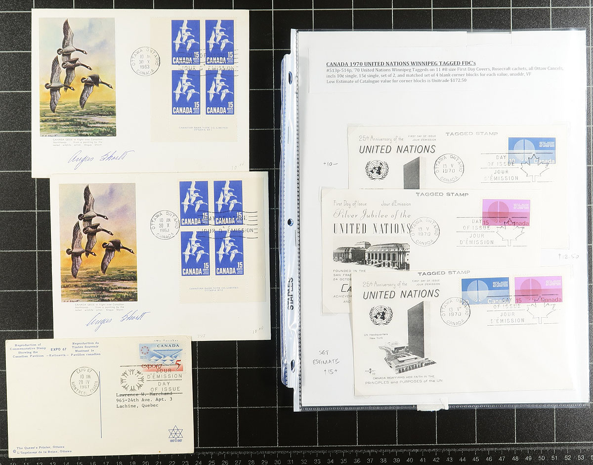 First Day Covers. Private cachet first day covers (mostly 1960-1980), filling an old butter box. Several hundred, about 2/3 are "Rosecraft" (including some in different coloured cachets) and the balance are from a wide array of cachet makers and a few are private or stamp club produced. Many are singles, but we did see a couple of batches with corner blocks. Most are addressed, as you would expect. There isn’t much order to this group, as the owner put them together from a variety of sources. A digger’s special! Estimate =