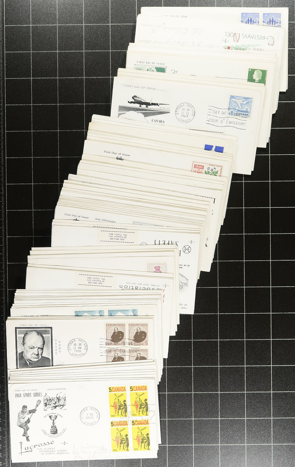 First Day Covers. Private cachet first day covers (mostly 1960-1980), filling an old butter box. Several hundred, about 2/3 are "Rosecraft" (including some in different coloured cachets) and the balance are from a wide array of cachet makers and a few are private or stamp club produced. Many are singles, but we did see a couple of batches with corner blocks. Most are addressed, as you would expect. There isn’t much order to this group, as the owner put them together from a variety of sources. A digger’s special! Estimate =