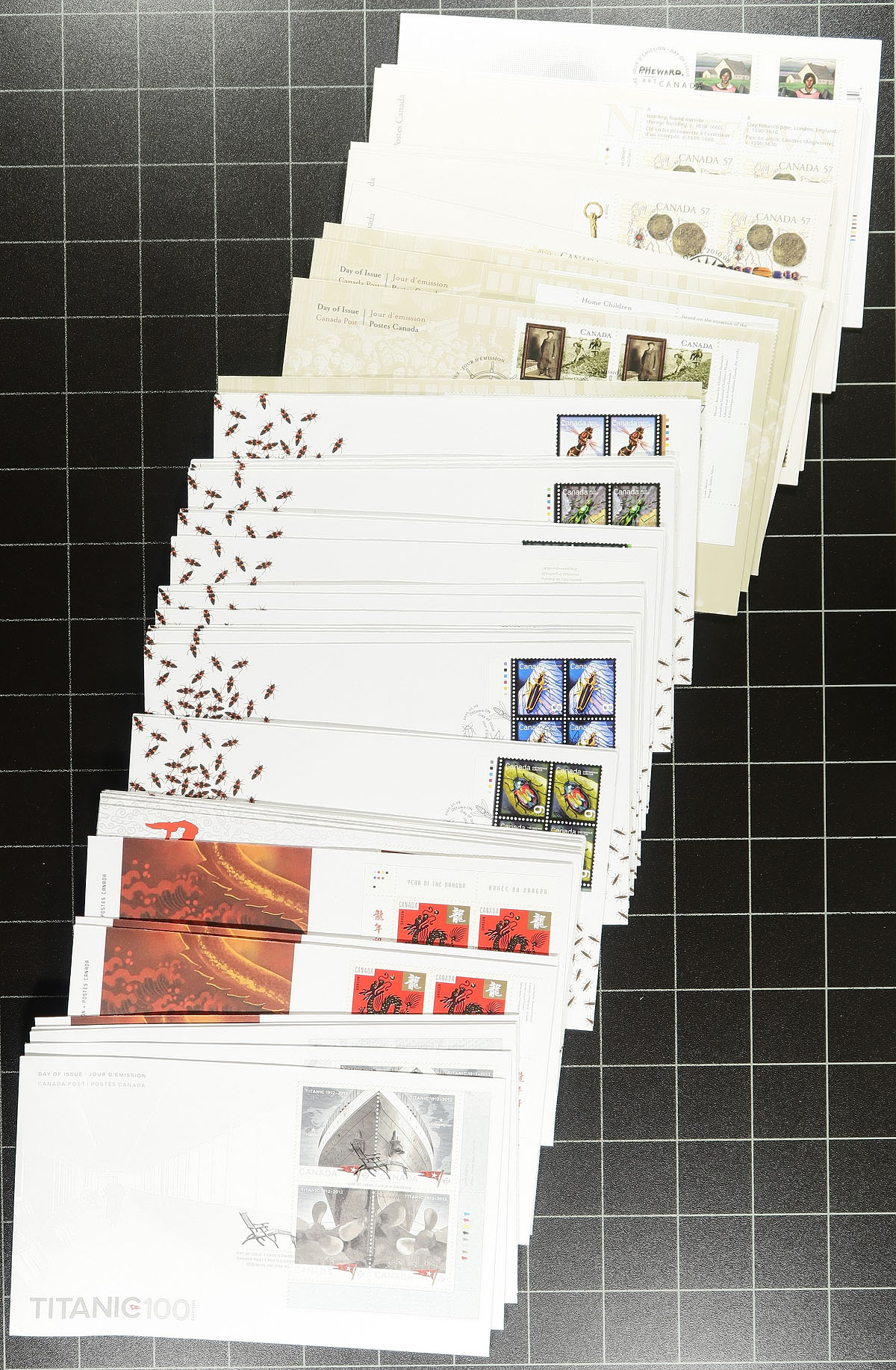 First Day Covers. Canada Post First Day Cover cachets 1971-2012 stuffed into a large sneaker box. Most are unsleeved, but there are a few presentation packs. Wide variety, with a bit of duplication. Huge original cost here - there is a bundle of 2012 covers with a Unitrade catalogue value of over $400.00! This explains why there are so few stocks of modern Canada FDCs on the market. All unaddressed and in good condition. Estimate =