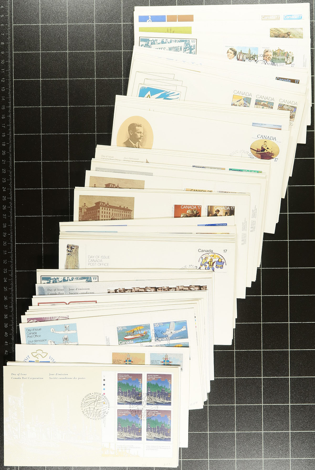 First Day Covers. Canada Post First Day Cover cachets 1971-2012 stuffed into a large sneaker box. Most are unsleeved, but there are a few presentation packs. Wide variety, with a bit of duplication. Huge original cost here - there is a bundle of 2012 covers with a Unitrade catalogue value of over $400.00! This explains why there are so few stocks of modern Canada FDCs on the market. All unaddressed and in good condition. Estimate =