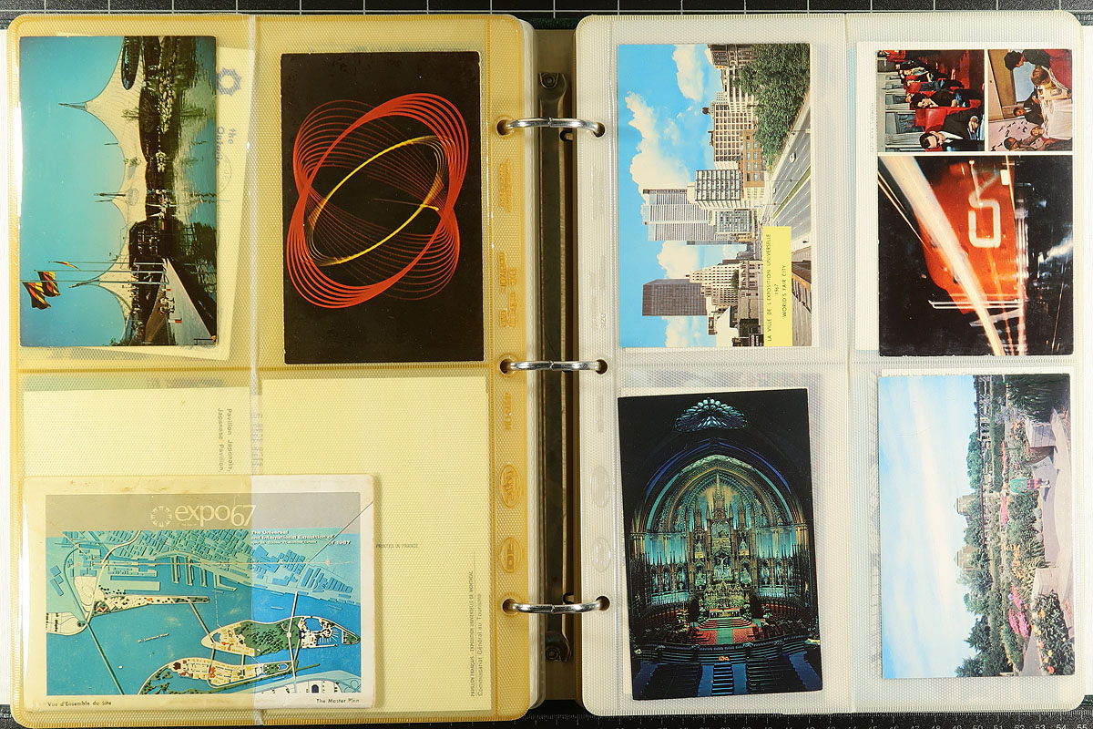 Four-volume "World’s Fair" collection of mostly covers and post cards. Strength is in Montreal Expo ’67 with reciprocating issues from many countries, noting cancels, exhibition and pavilion cachets/handstamps, Cinderellas. Over 60 Expo ’88 Brisbane cacheted covers - the cachets are all the same, but there are all-different cancels honouring various countries’ "Day" in a bespoke binder. The lot concludes with two large binders of post cards. Some go back to the 1930's, but we saw a number from Seattle ’62, significant quantities of different Montreal ’67 (lots of "Benjamin" cards), Osaka ’70, Spokane ’74, Vancouver ’86, plus a bit of non-Expo material. An extensive holding with hundreds of items, not easily replicated. Estimate =