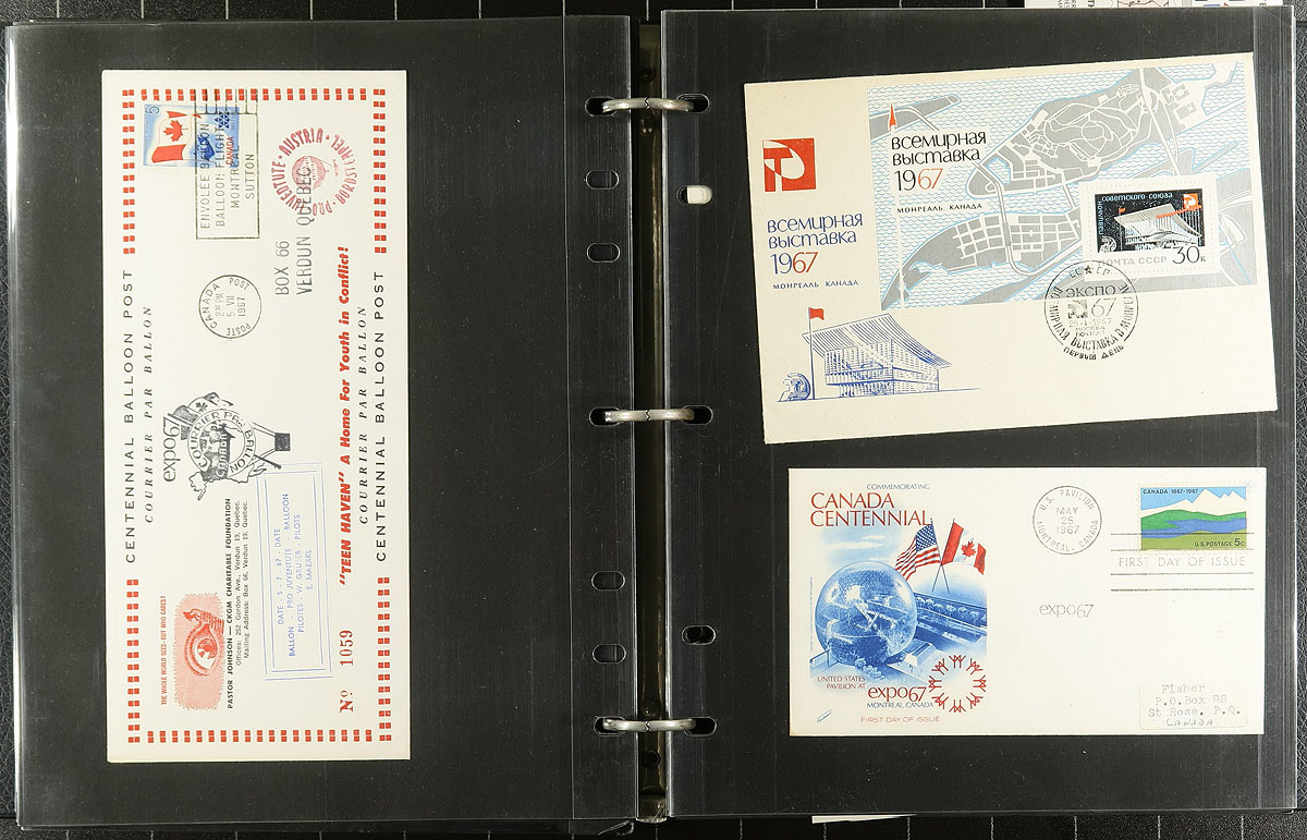 Four-volume "World’s Fair" collection of mostly covers and post cards. Strength is in Montreal Expo ’67 with reciprocating issues from many countries, noting cancels, exhibition and pavilion cachets/handstamps, Cinderellas. Over 60 Expo ’88 Brisbane cacheted covers - the cachets are all the same, but there are all-different cancels honouring various countries’ "Day" in a bespoke binder. The lot concludes with two large binders of post cards. Some go back to the 1930's, but we saw a number from Seattle ’62, significant quantities of different Montreal ’67 (lots of "Benjamin" cards), Osaka ’70, Spokane ’74, Vancouver ’86, plus a bit of non-Expo material. An extensive holding with hundreds of items, not easily replicated. Estimate =