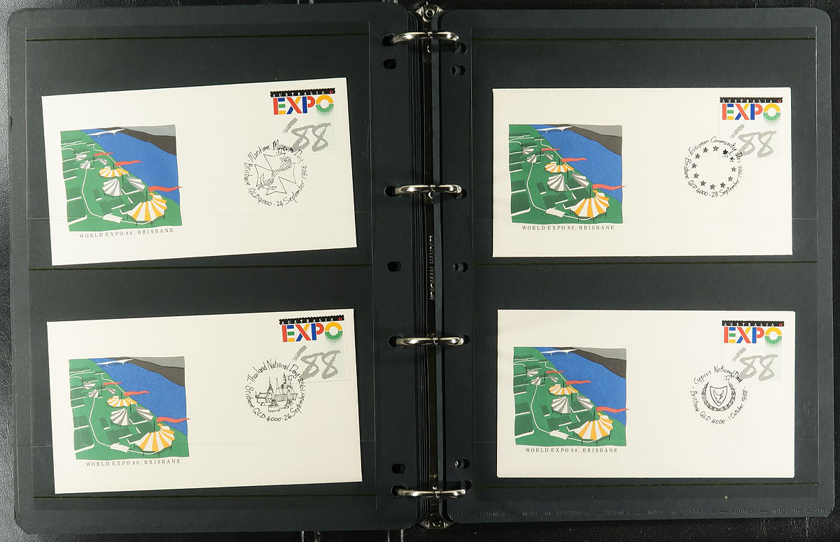 Four-volume "World’s Fair" collection of mostly covers and post cards. Strength is in Montreal Expo ’67 with reciprocating issues from many countries, noting cancels, exhibition and pavilion cachets/handstamps, Cinderellas. Over 60 Expo ’88 Brisbane cacheted covers - the cachets are all the same, but there are all-different cancels honouring various countries’ "Day" in a bespoke binder. The lot concludes with two large binders of post cards. Some go back to the 1930's, but we saw a number from Seattle ’62, significant quantities of different Montreal ’67 (lots of "Benjamin" cards), Osaka ’70, Spokane ’74, Vancouver ’86, plus a bit of non-Expo material. An extensive holding with hundreds of items, not easily replicated. Estimate =
