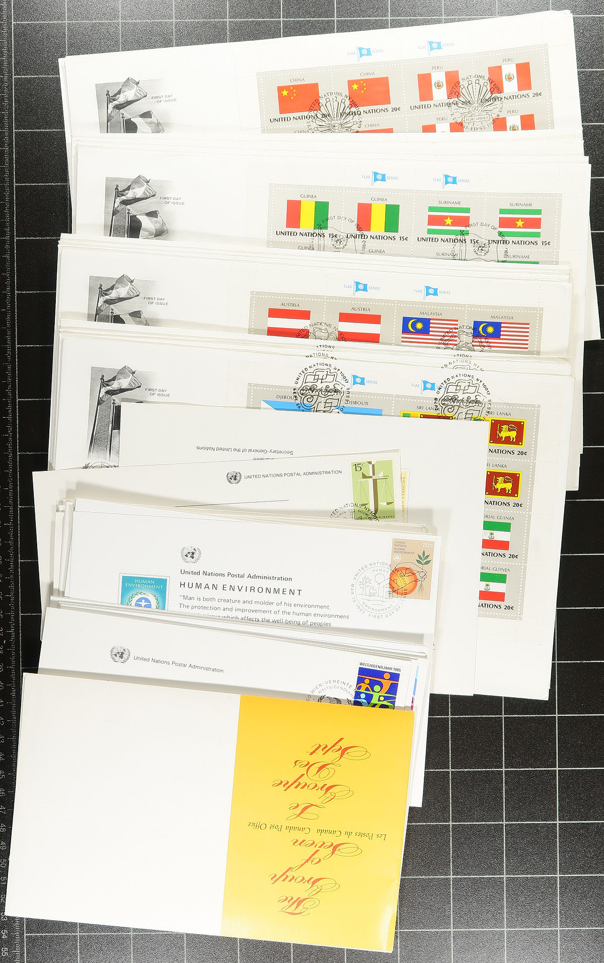 A bankers box filled with a diverse batch of "goodies" from the 1950's-2012. With a mint and used stock, a couple of albums with mint singles and blocks, commemorative panels and folders, two volumes and a FDC album filled with 1960's First Day Covers and a batch from Geneva (up to 1982). There is a page of 1980's Geneva mint blocks, some 21st century mini-panes and souvenir sheets, with lots of face value. The binders were not treated well, but the material has survived and thrives! Enormous initial cost. Estimate =