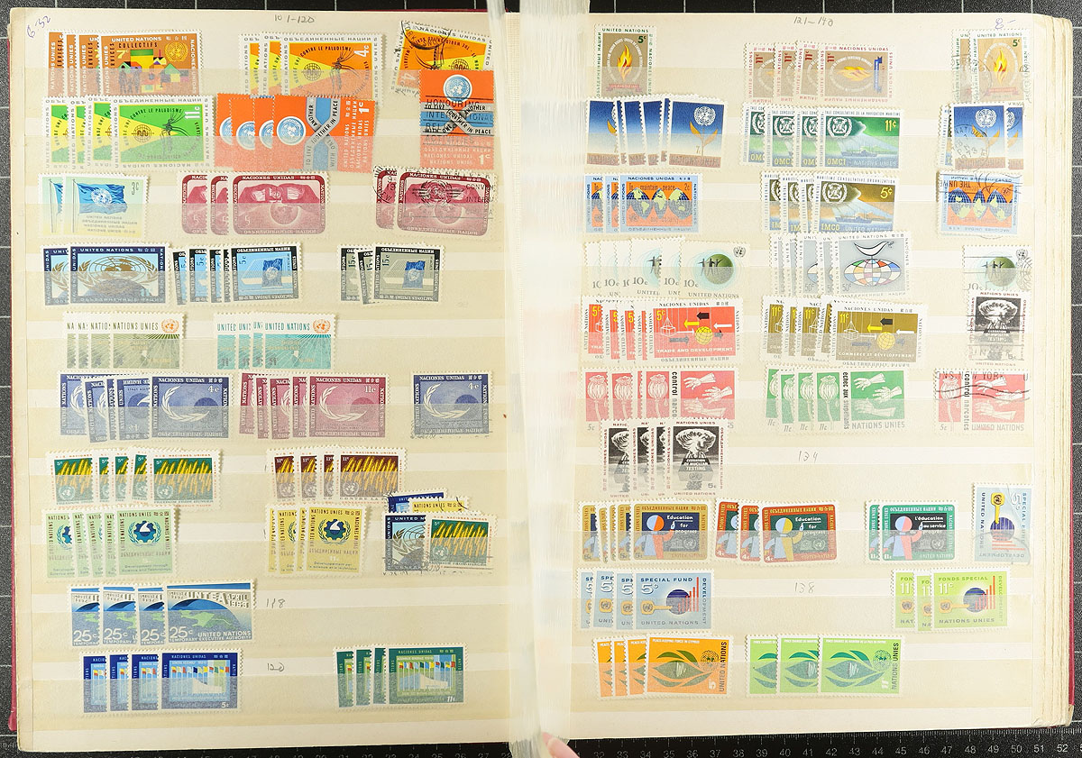 A bankers box filled with a diverse batch of "goodies" from the 1950's-2012. With a mint and used stock, a couple of albums with mint singles and blocks, commemorative panels and folders, two volumes and a FDC album filled with 1960's First Day Covers and a batch from Geneva (up to 1982). There is a page of 1980's Geneva mint blocks, some 21st century mini-panes and souvenir sheets, with lots of face value. The binders were not treated well, but the material has survived and thrives! Enormous initial cost. Estimate =