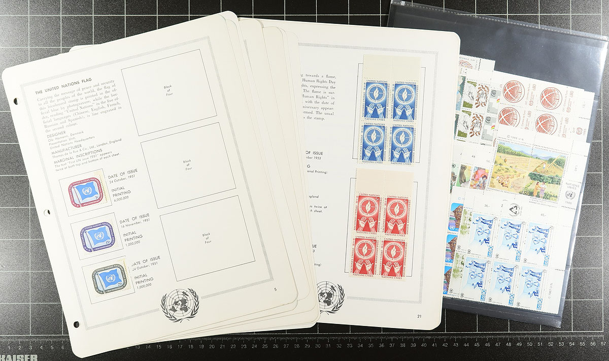 A bankers box filled with a diverse batch of "goodies" from the 1950's-2012. With a mint and used stock, a couple of albums with mint singles and blocks, commemorative panels and folders, two volumes and a FDC album filled with 1960's First Day Covers and a batch from Geneva (up to 1982). There is a page of 1980's Geneva mint blocks, some 21st century mini-panes and souvenir sheets, with lots of face value. The binders were not treated well, but the material has survived and thrives! Enormous initial cost. Estimate =
