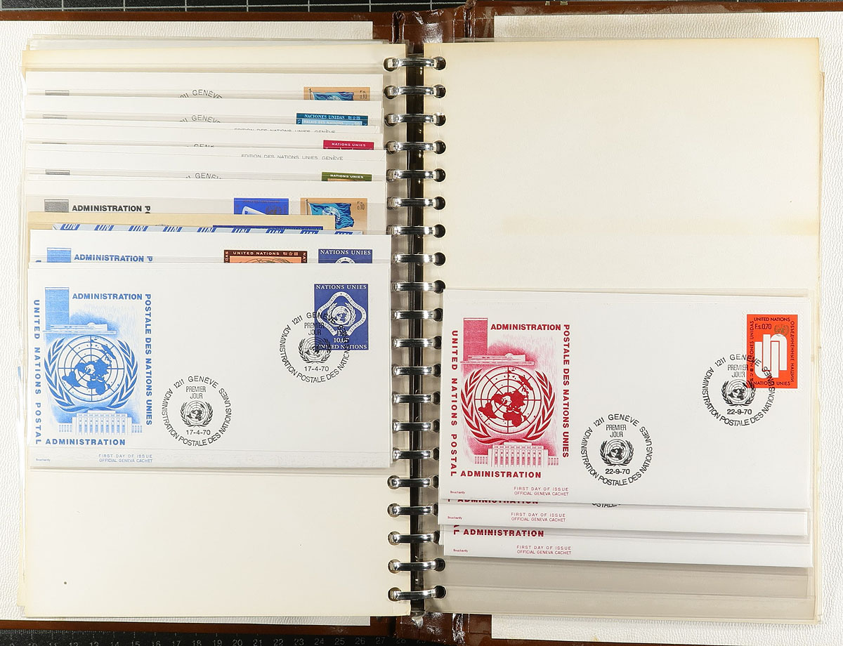 A bankers box filled with a diverse batch of "goodies" from the 1950's-2012. With a mint and used stock, a couple of albums with mint singles and blocks, commemorative panels and folders, two volumes and a FDC album filled with 1960's First Day Covers and a batch from Geneva (up to 1982). There is a page of 1980's Geneva mint blocks, some 21st century mini-panes and souvenir sheets, with lots of face value. The binders were not treated well, but the material has survived and thrives! Enormous initial cost. Estimate =
