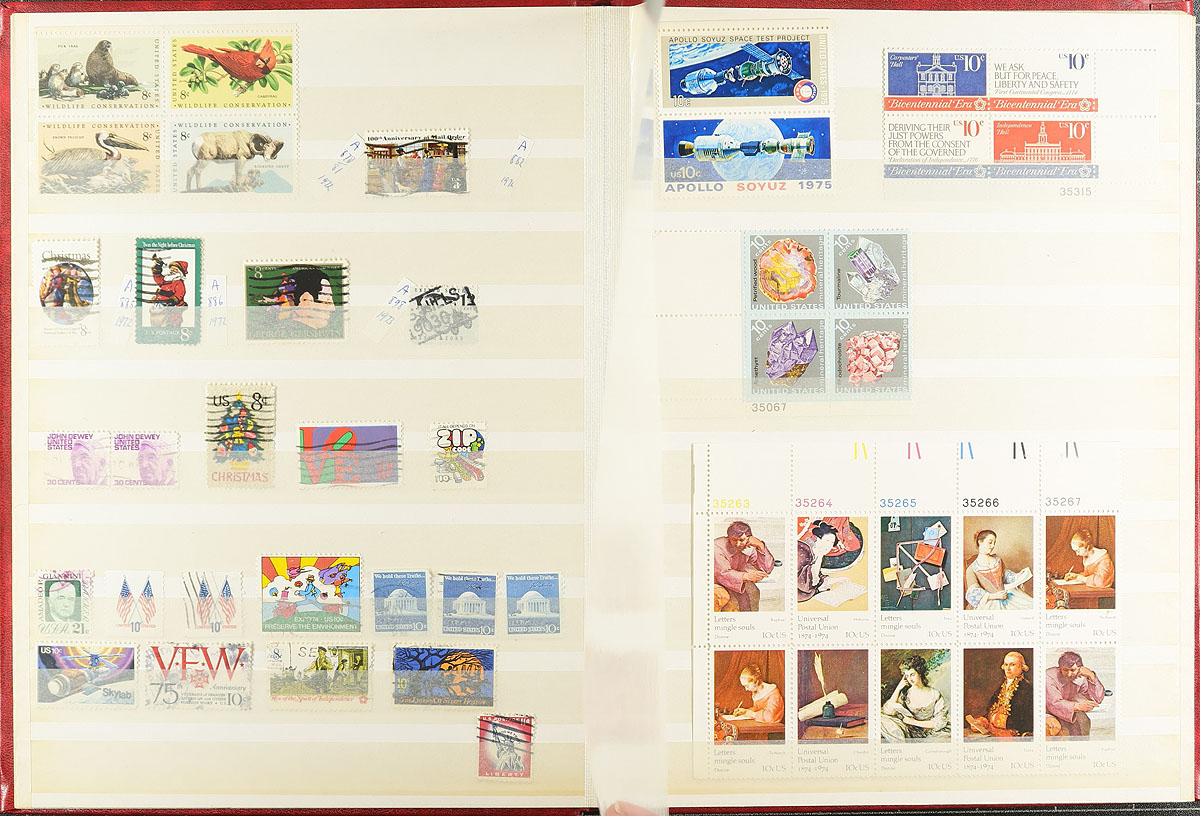 A U-Haul box with an estate balance, with a mix of mint and used, old and new. The mint includes a number of 1970's-1990's year folders and albums, 5 "graded" stamps (relatively common but given "95" ratings), a big group of coils (many with plate numbers - strength in the Transportation and Officials), plus a never hinged block of 10 of #J63 (a bit off-centre and two with natural paper crease - cat $350.00). The used includes a battered "Liberty" album, a stockbook, and several stockpages and album sections (mostly common, but some better may lurk), with a touch from the back of the book. Estimate =