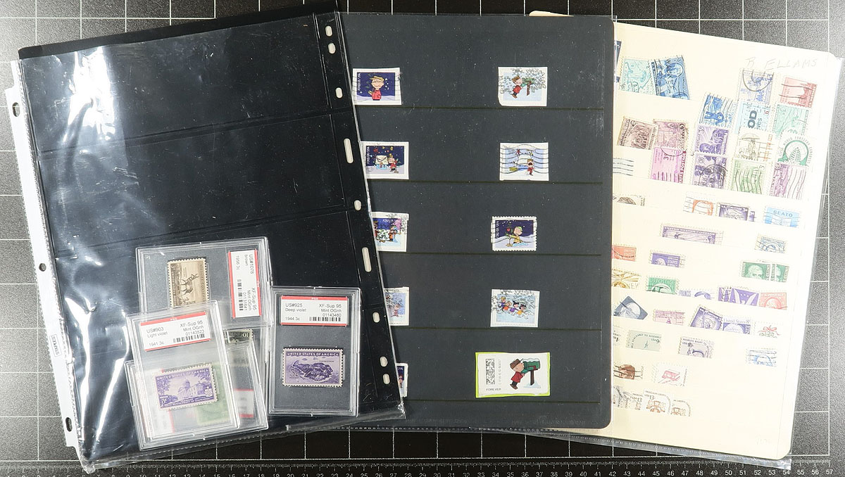 A U-Haul box with an estate balance, with a mix of mint and used, old and new. The mint includes a number of 1970's-1990's year folders and albums, 5 "graded" stamps (relatively common but given "95" ratings), a big group of coils (many with plate numbers - strength in the Transportation and Officials), plus a never hinged block of 10 of #J63 (a bit off-centre and two with natural paper crease - cat $350.00). The used includes a battered "Liberty" album, a stockbook, and several stockpages and album sections (mostly common, but some better may lurk), with a touch from the back of the book. Estimate =