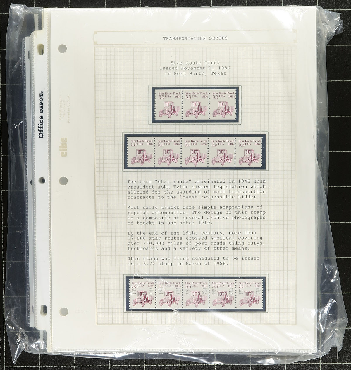 A U-Haul box with an estate balance, with a mix of mint and used, old and new. The mint includes a number of 1970's-1990's year folders and albums, 5 "graded" stamps (relatively common but given "95" ratings), a big group of coils (many with plate numbers - strength in the Transportation and Officials), plus a never hinged block of 10 of #J63 (a bit off-centre and two with natural paper crease - cat $350.00). The used includes a battered "Liberty" album, a stockbook, and several stockpages and album sections (mostly common, but some better may lurk), with a touch from the back of the book. Estimate =