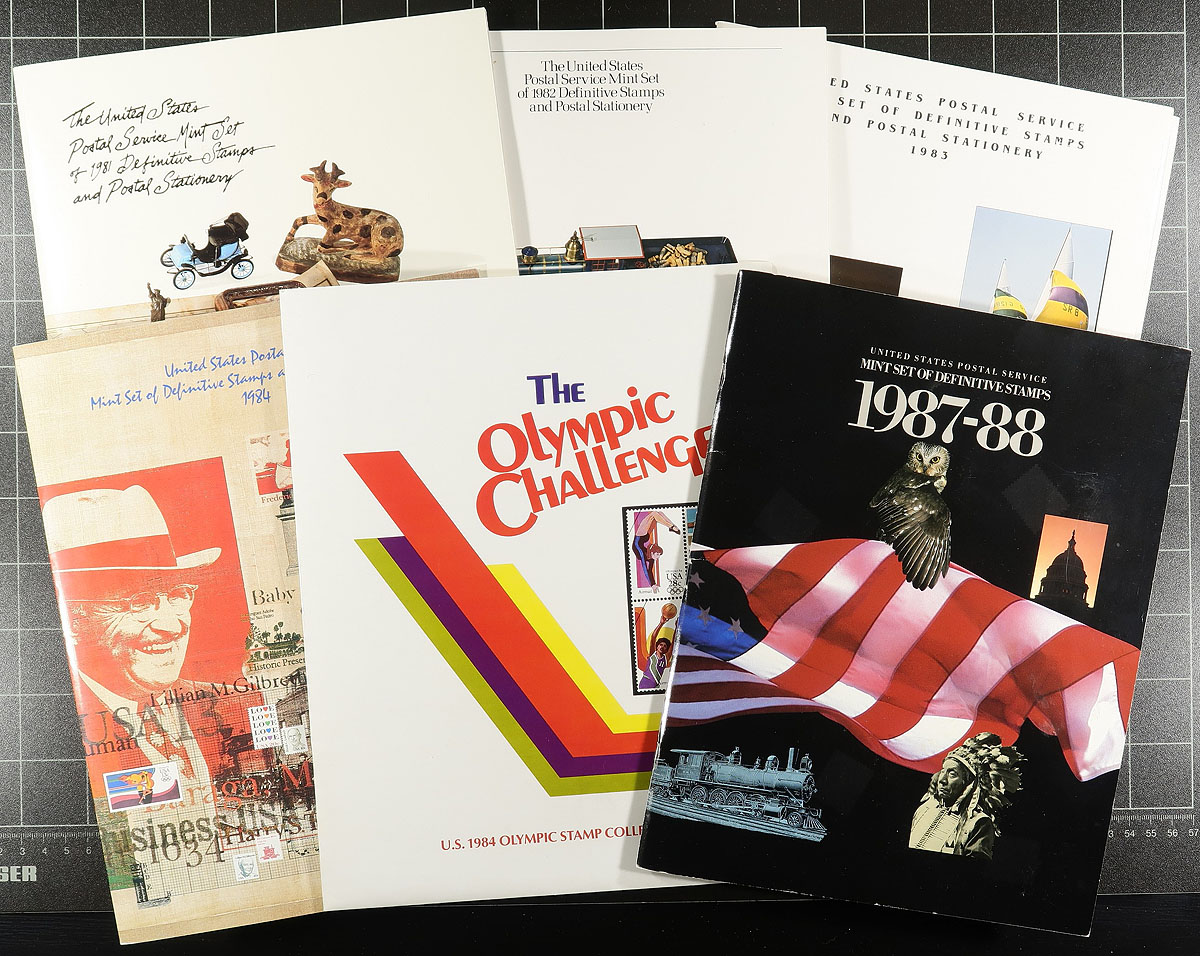 A U-Haul box with an estate balance, with a mix of mint and used, old and new. The mint includes a number of 1970's-1990's year folders and albums, 5 "graded" stamps (relatively common but given "95" ratings), a big group of coils (many with plate numbers - strength in the Transportation and Officials), plus a never hinged block of 10 of #J63 (a bit off-centre and two with natural paper crease - cat $350.00). The used includes a battered "Liberty" album, a stockbook, and several stockpages and album sections (mostly common, but some better may lurk), with a touch from the back of the book. Estimate =