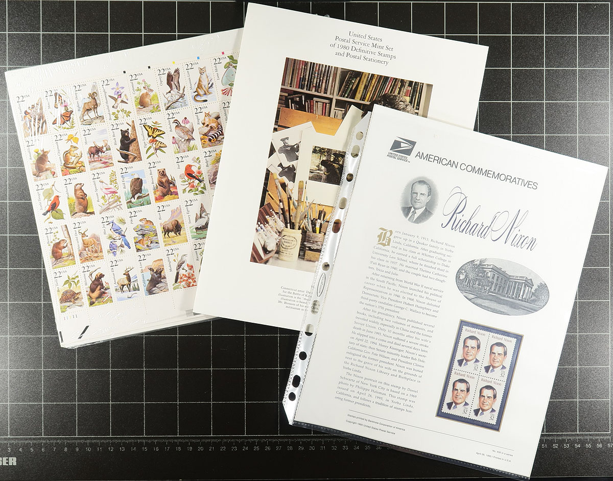 A U-Haul box with an estate balance, with a mix of mint and used, old and new. The mint includes a number of 1970's-1990's year folders and albums, 5 "graded" stamps (relatively common but given "95" ratings), a big group of coils (many with plate numbers - strength in the Transportation and Officials), plus a never hinged block of 10 of #J63 (a bit off-centre and two with natural paper crease - cat $350.00). The used includes a battered "Liberty" album, a stockbook, and several stockpages and album sections (mostly common, but some better may lurk), with a touch from the back of the book. Estimate =
