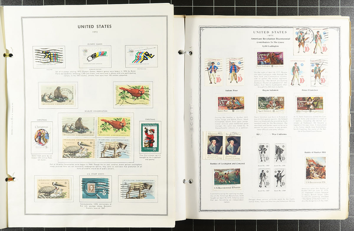 A U-Haul box with an estate balance, with a mix of mint and used, old and new. The mint includes a number of 1970's-1990's year folders and albums, 5 "graded" stamps (relatively common but given "95" ratings), a big group of coils (many with plate numbers - strength in the Transportation and Officials), plus a never hinged block of 10 of #J63 (a bit off-centre and two with natural paper crease - cat $350.00). The used includes a battered "Liberty" album, a stockbook, and several stockpages and album sections (mostly common, but some better may lurk), with a touch from the back of the book. Estimate =