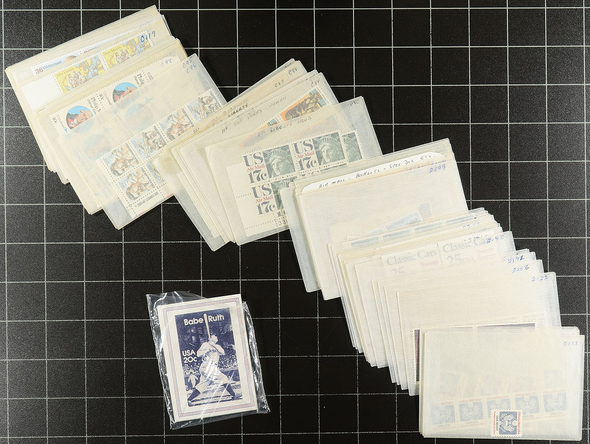 A U-Haul box with an estate balance, with a mix of mint and used, old and new. The mint includes a number of 1970's-1990's year folders and albums, 5 "graded" stamps (relatively common but given "95" ratings), a big group of coils (many with plate numbers - strength in the Transportation and Officials), plus a never hinged block of 10 of #J63 (a bit off-centre and two with natural paper crease - cat $350.00). The used includes a battered "Liberty" album, a stockbook, and several stockpages and album sections (mostly common, but some better may lurk), with a touch from the back of the book. Estimate =