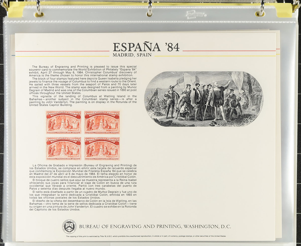 Souvenir Pages and cards covering 1973-1988 in a bankers box. There are three "USPS" 23-ring binders housing 170 1984-1988 "Souvenir Pages" (listed in Scott Specialized at over US$550.00). A binder and bundle of over 75 souvenir cards, often issued for philatelic and numismatic exhibitions. Includes covers franked with the Columbus 1992 anniversary from USA, Italy, Portugal, Spain and reproduction tickets of the 1892 stamp Exposition. Estimate =