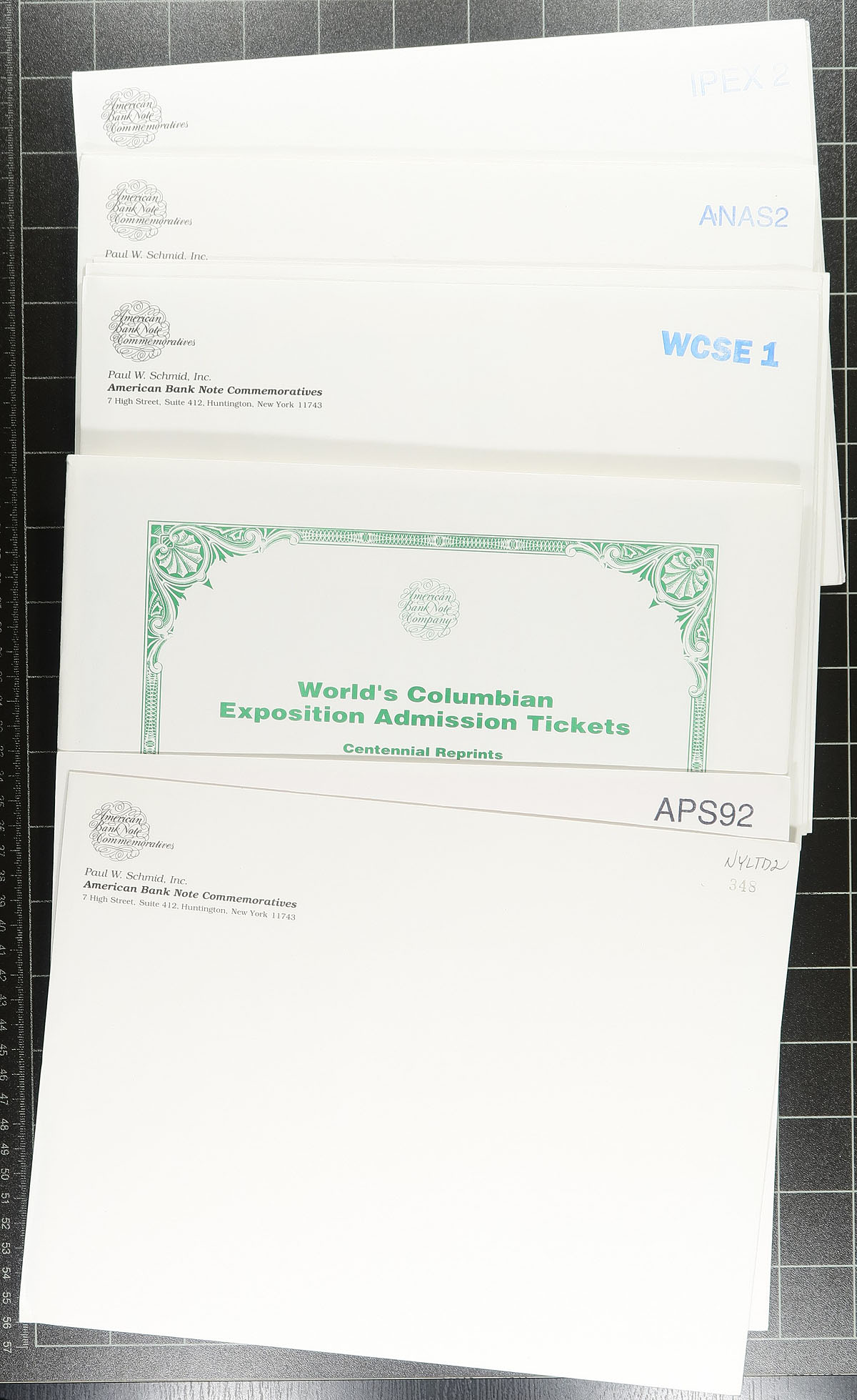 Souvenir Pages and cards covering 1973-1988 in a bankers box. There are three "USPS" 23-ring binders housing 170 1984-1988 "Souvenir Pages" (listed in Scott Specialized at over US$550.00). A binder and bundle of over 75 souvenir cards, often issued for philatelic and numismatic exhibitions. Includes covers franked with the Columbus 1992 anniversary from USA, Italy, Portugal, Spain and reproduction tickets of the 1892 stamp Exposition. Estimate =