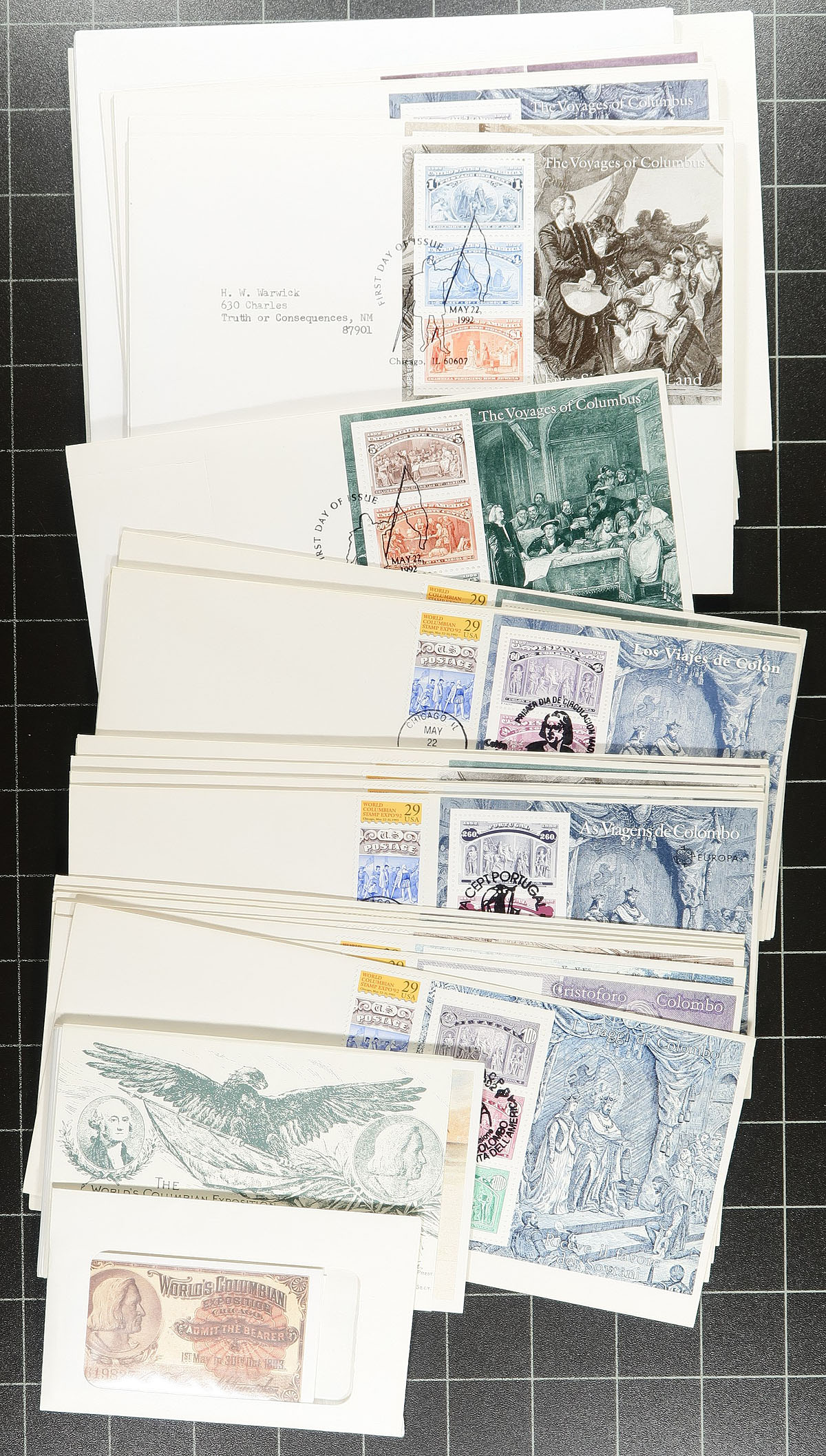 Souvenir Pages and cards covering 1973-1988 in a bankers box. There are three "USPS" 23-ring binders housing 170 1984-1988 "Souvenir Pages" (listed in Scott Specialized at over US$550.00). A binder and bundle of over 75 souvenir cards, often issued for philatelic and numismatic exhibitions. Includes covers franked with the Columbus 1992 anniversary from USA, Italy, Portugal, Spain and reproduction tickets of the 1892 stamp Exposition. Estimate =