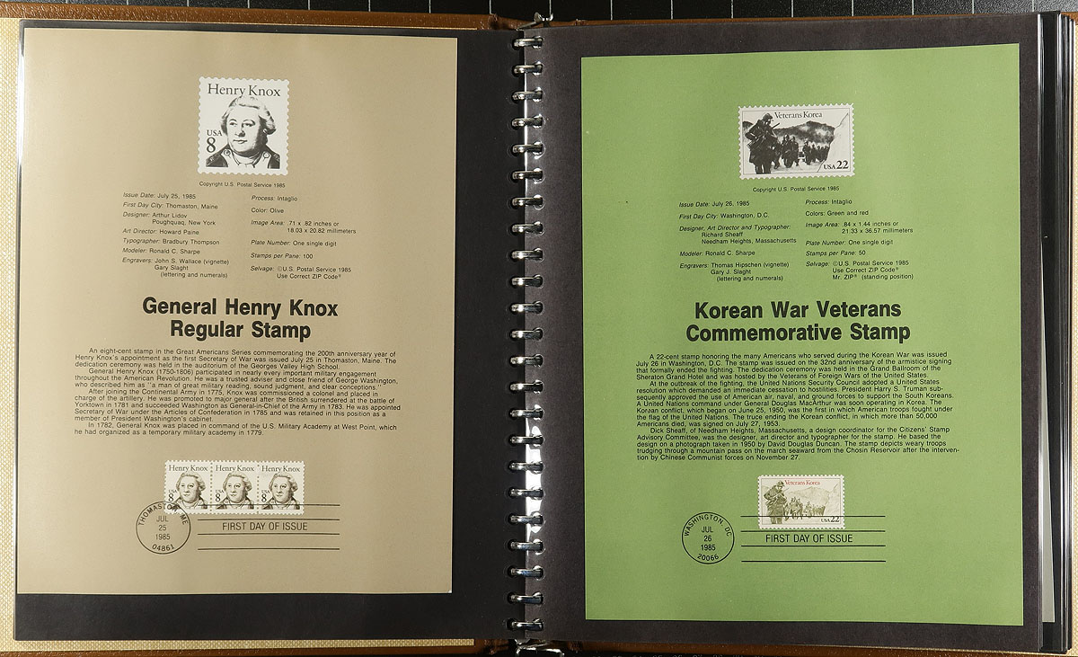 Souvenir Pages and cards covering 1973-1988 in a bankers box. There are three "USPS" 23-ring binders housing 170 1984-1988 "Souvenir Pages" (listed in Scott Specialized at over US$550.00). A binder and bundle of over 75 souvenir cards, often issued for philatelic and numismatic exhibitions. Includes covers franked with the Columbus 1992 anniversary from USA, Italy, Portugal, Spain and reproduction tickets of the 1892 stamp Exposition. Estimate =