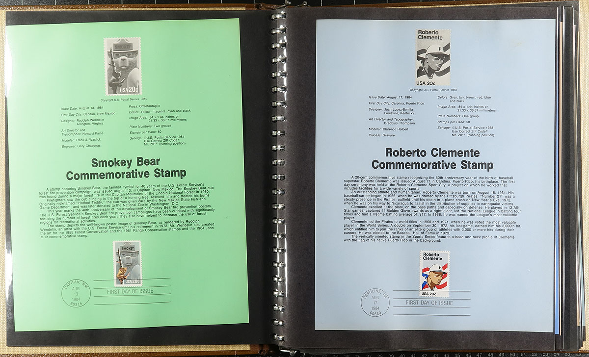 Souvenir Pages and cards covering 1973-1988 in a bankers box. There are three "USPS" 23-ring binders housing 170 1984-1988 "Souvenir Pages" (listed in Scott Specialized at over US$550.00). A binder and bundle of over 75 souvenir cards, often issued for philatelic and numismatic exhibitions. Includes covers franked with the Columbus 1992 anniversary from USA, Italy, Portugal, Spain and reproduction tickets of the 1892 stamp Exposition. Estimate =
