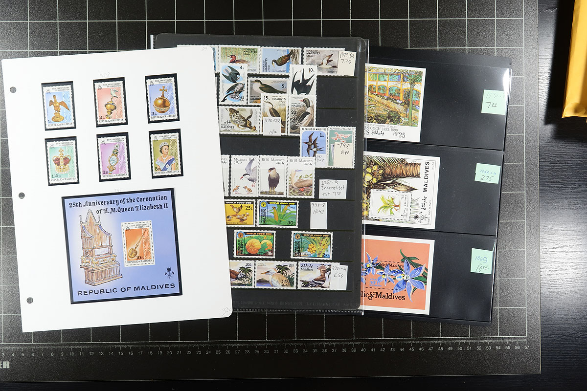 Mint accumulation from several colonies, most on stockpages and most are never hinged. Maldive Islands, two groups from 1974-2003 (cat $250.00), Aitutaki 1985 official wholesale group (cat $200.00), Guyana (21st century selection (catalogue $180.00), Belize 1974-1980's (48 diff cat $112.00), Tuvalu 1986 Royal Wedding imperforates, with some Disney topicals, and earlier selections from St. Helena, Seychelles and Tonga. Great condition. Estimate =
