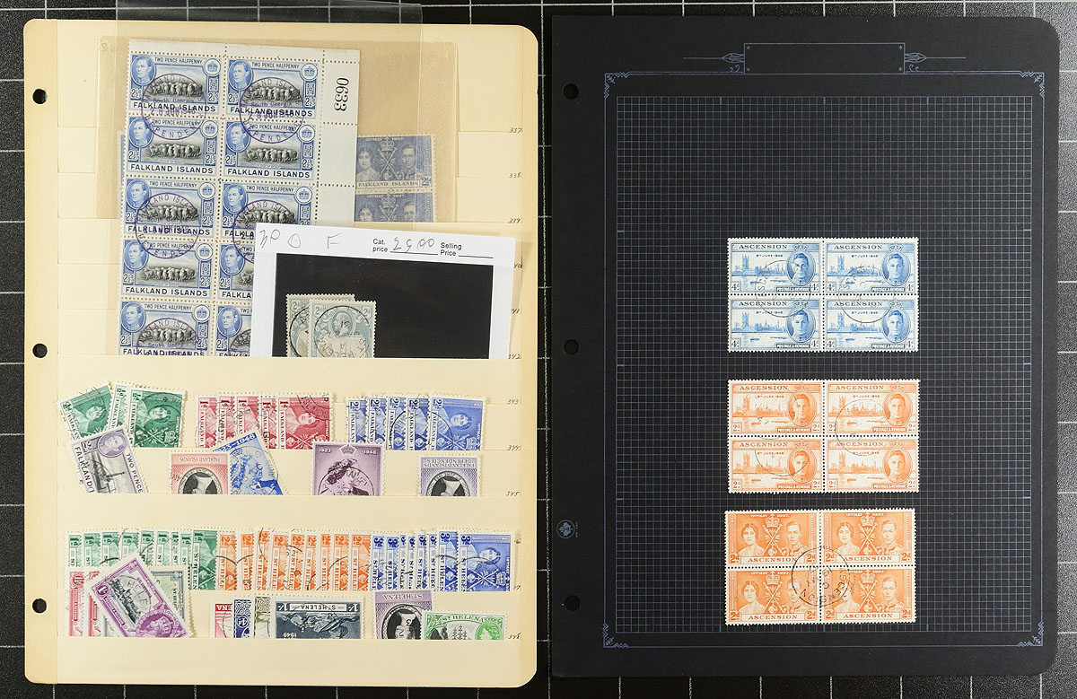 Used selection from several colonies, including a few where used is more difficult to find than mint. Strength is in British South Atlantic with Ascension (#13 x2, 1948 Silver Wedding high value), Falklands (#34, #100), St. Helena, Tristan da Cunha. From the same area is a page of St. Lucia (a bit of mint mixed in here) and then two pages with a century of Hong Kong issues (catalogues $225.00). A very nice selection, perfect to fill in spaces or to break up for sale. Estimate =